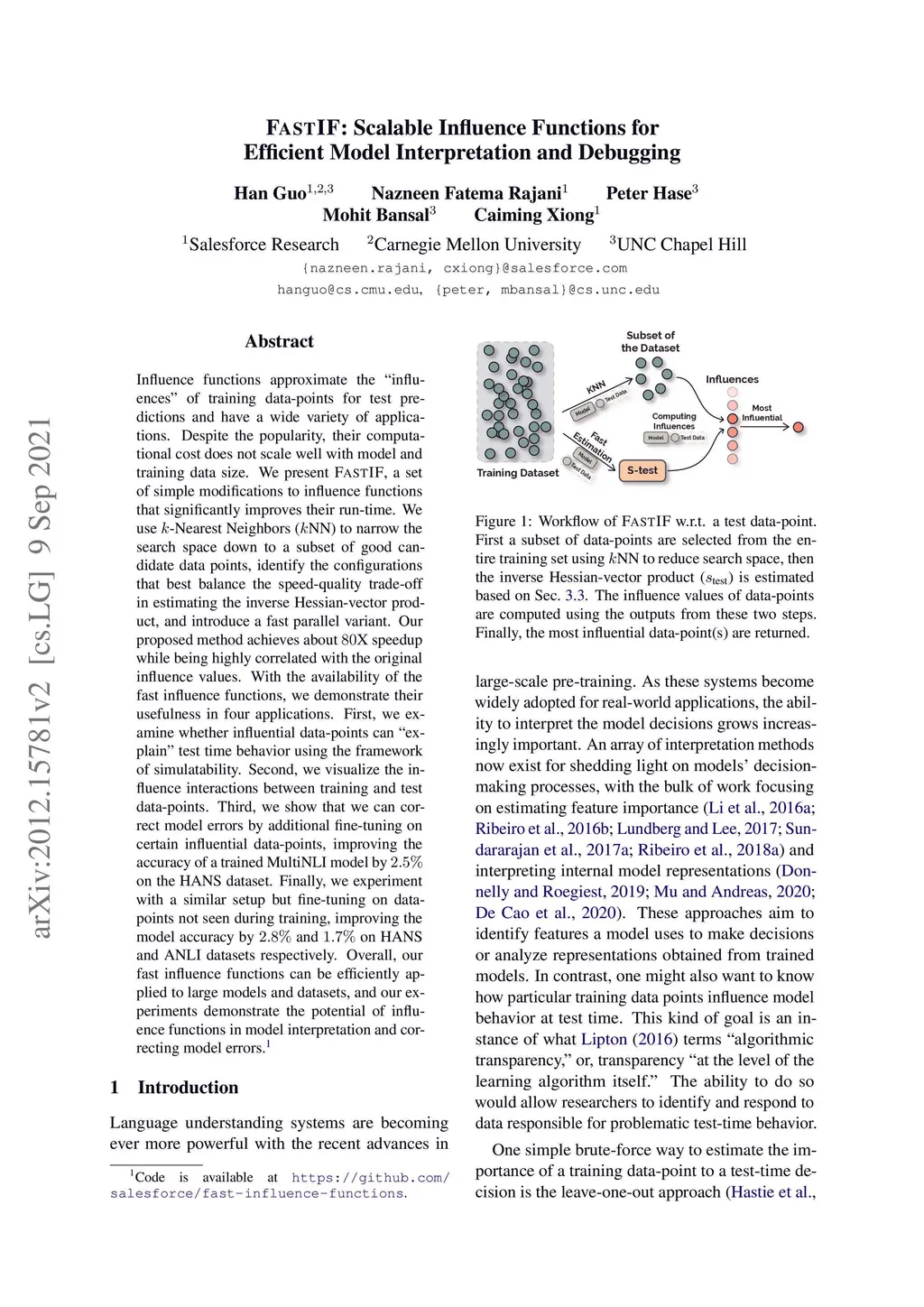Influence functions approximate the "influences" of training data-points for test predictions and have a wide variety of applications. Despite the popularity, their computational cost does not scale well with model and training data size. We present FastIF, a set of simple modifications to influence functions that significantly improves their run-time. We use k-Nearest Neighbors (kNN) to narrow the search space down to a subset of good candidate data points, identify the configurations that best balance the speed-quality trade-off in estimating the inverse Hessian-vector product, and introduce a fast parallel variant. Our proposed method achieves about 80X speedup while being highly correlated with the original influence values. With the availability of the fast influence functions, we demonstrate their usefulness in four applications. First, we examine whether influential data-points can "explain" test time behavior using the framework of simulatability. Second, we visualize the influence interactions between training and test data-points. Third, we show that we can correct model errors by additional fine-tuning on certain influential data-points, improving the accuracy of a trained MultiNLI model by 2.5% on the HANS dataset. Finally, we experiment with a similar setup but fine-tuning on datapoints not seen during training, improving the model accuracy by 2.8% and 1.7% on HANS and ANLI datasets respectively. Overall, our fast influence functions can be efficiently applied to large models and datasets, and our experiments demonstrate the potential of influence functions in model interpretation and correcting model errors. Code is available at https://github.com/salesforce/fast-influence-functions