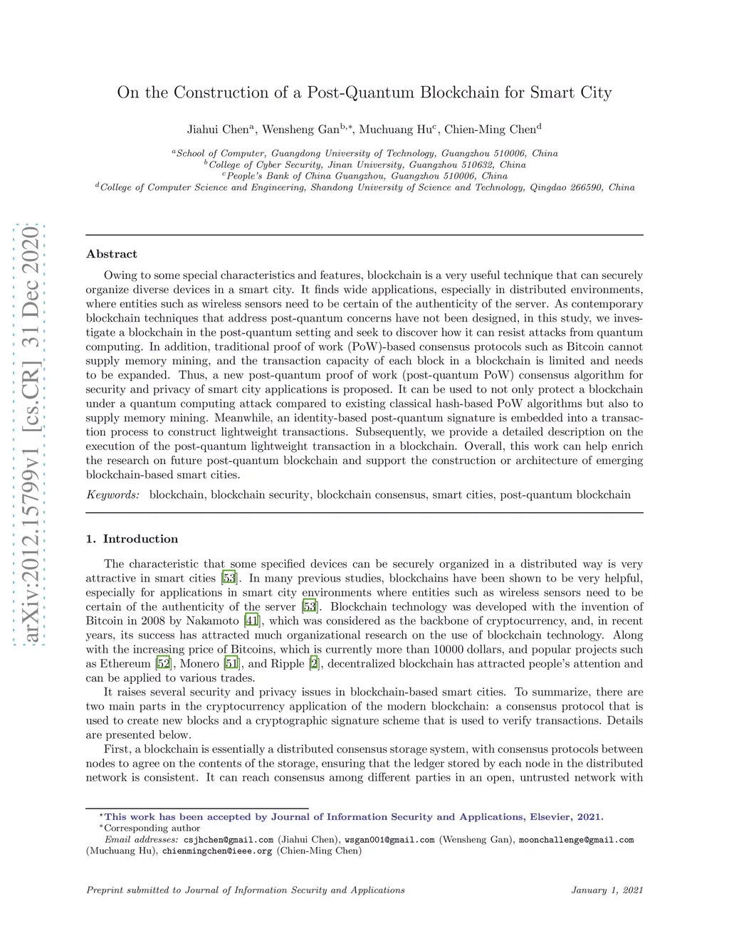 On the Construction of a Post-Quantum Blockchain for Smart City