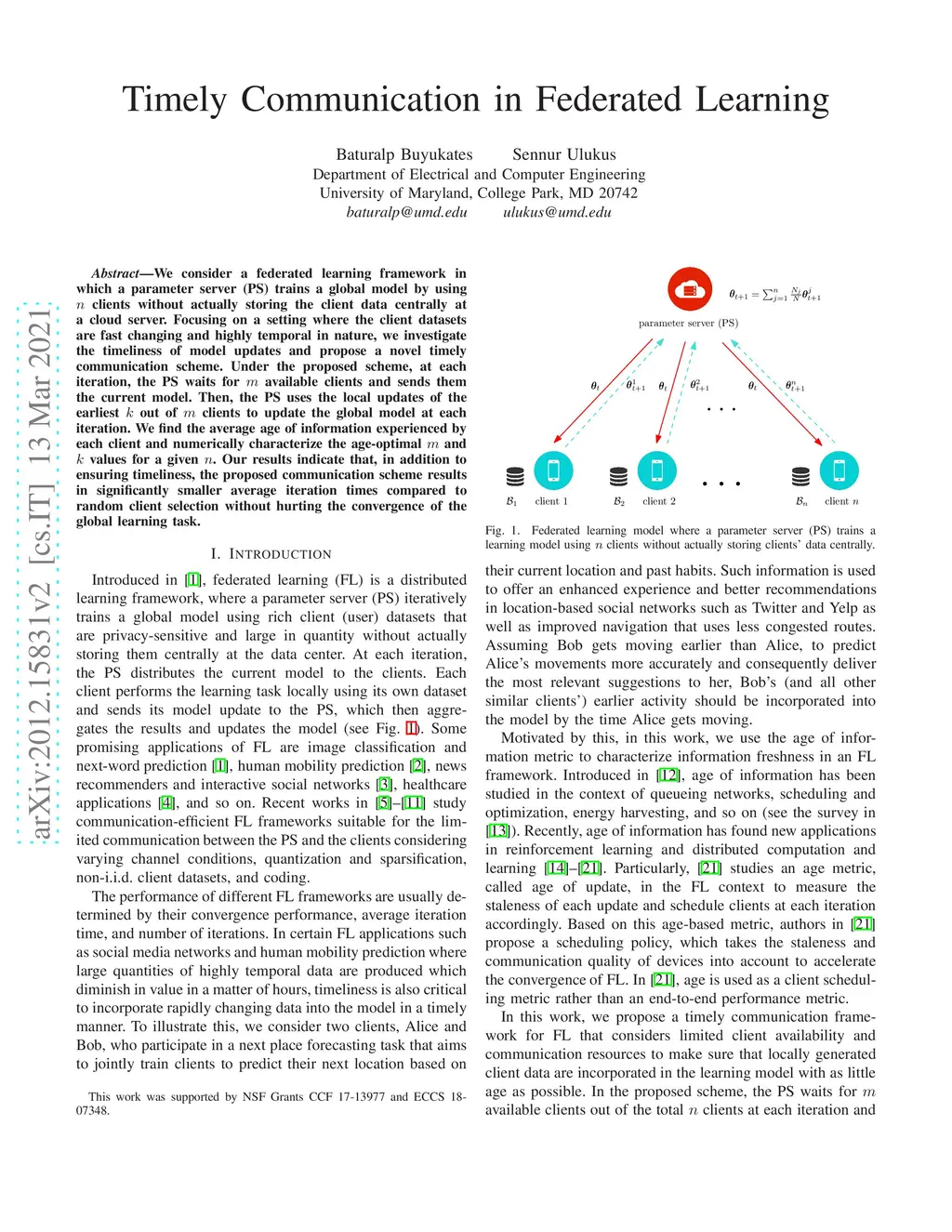 We consider a federated learning framework in which a parameter server (PS) trains a global model by using clients without actually storing the client data centrally at a cloud server. Focusing on a setting where the client datasets are fast changing and highly temporal in nature, we investigate the timeliness of model updates and propose a novel timely communication scheme. Under the proposed scheme, at each iteration, the PS waits for available clients and sends them the current model. Then, the PS uses the local updates of the earliest out of clients to update the global model at each iteration. We find the average age of information experienced by each client and numerically characterize the age-optimal and values for a given . Our results indicate that, in addition to ensuring timeliness, the proposed communication scheme results in significantly smaller average iteration times compared to random client selection without hurting the convergence of the global learning task.