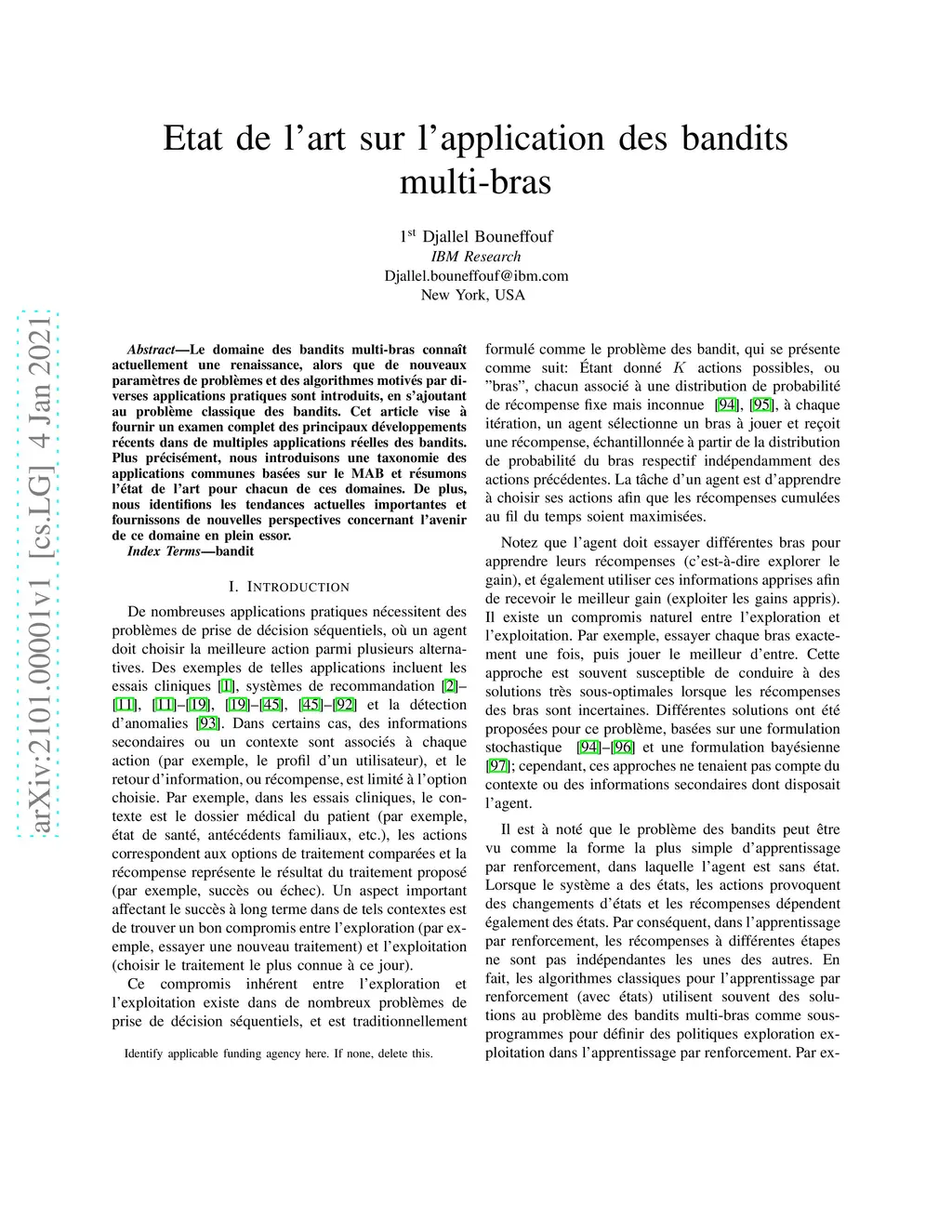 The Multi-armed bandit offer the advantage to learn and exploit the already learnt knowledge at the same time. This capability allows this approach to be applied in different domains, going from clinical trials where the goal is investigating the effects of different experimental treatments while minimizing patient losses, to adaptive routing where the goal is to minimize the delays in a network. This article provides a review of the recent results on applying bandit to real-life scenario and summarize the state of the art for each of these fields. Different techniques has been proposed to solve this problem setting, like epsilon-greedy, Upper confident bound (UCB) and Thompson Sampling (TS). We are showing here how this algorithms were adapted to solve the different problems of exploration exploitation.