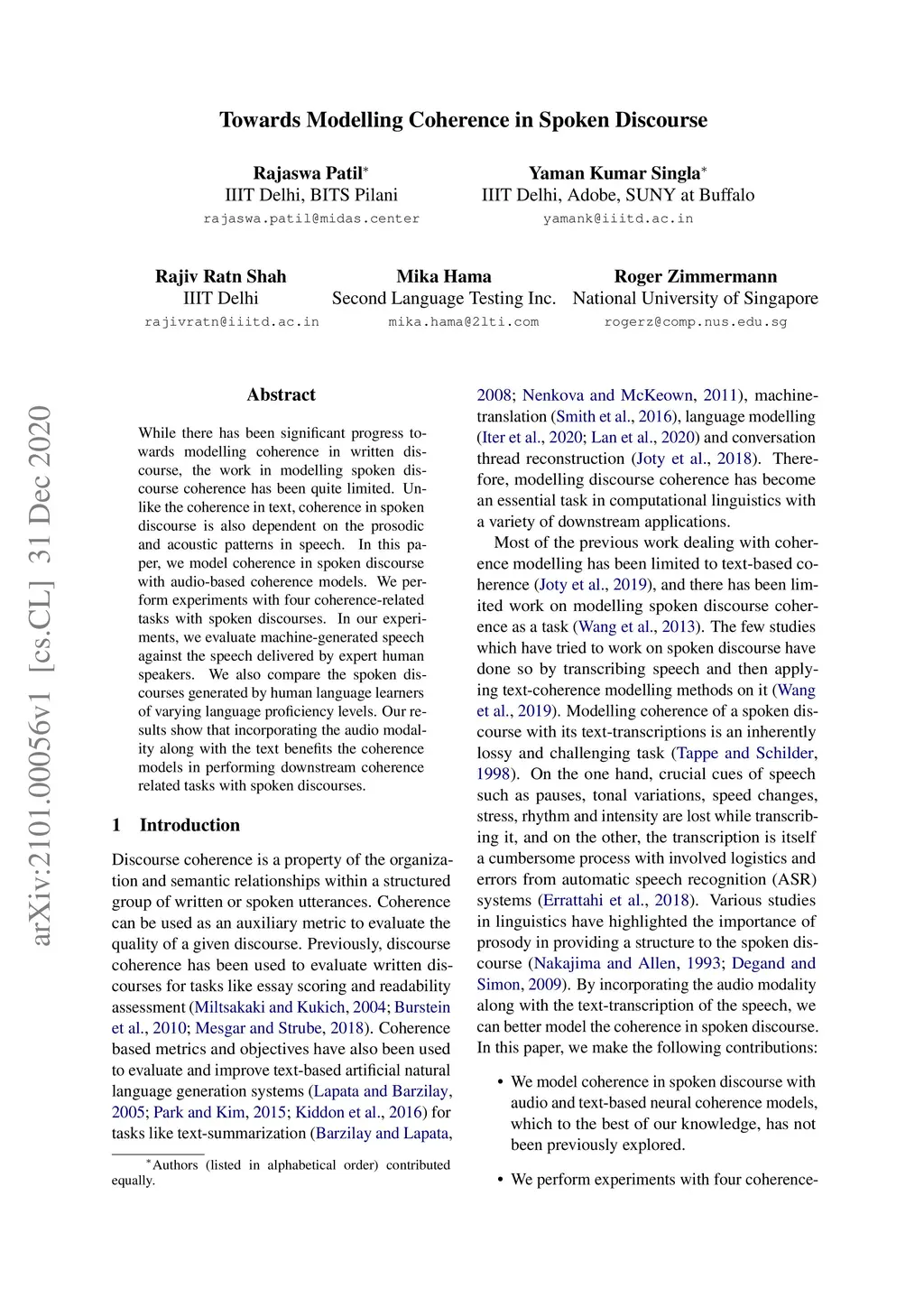 While there has been significant progress towards modelling coherence in written discourse, the work in modelling spoken discourse coherence has been quite limited. Unlike the coherence in text, coherence in spoken discourse is also dependent on the prosodic and acoustic patterns in speech. In this paper, we model coherence in spoken discourse with audio-based coherence models. We perform experiments with four coherence-related tasks with spoken discourses. In our experiments, we evaluate machine-generated speech against the speech delivered by expert human speakers. We also compare the spoken discourses generated by human language learners of varying language proficiency levels. Our results show that incorporating the audio modality along with the text benefits the coherence models in performing downstream coherence related tasks with spoken discourses.