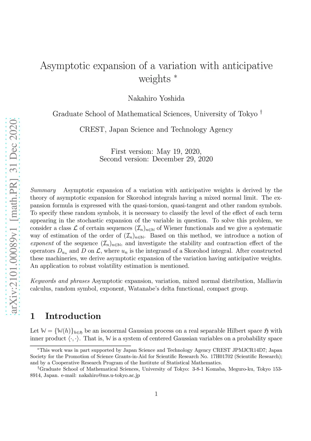 Asymptotic expansion of a variation with anticipative weights is derived by the theory of asymptotic expansion for Skorohod integrals having a mixed normal limit. The expansion formula is expressed with the quasi-torsion, quasi-tangent and other random symbols. To specify these random symbols, it is necessary to classify the level of the effect of each term appearing in the stochastic expansion of the variable in question. To solve this problem, we consider a class of certain sequences of Wiener functionals and we give a systematic way of estimation of the order of . Based on this method, we introduce a notion of exponent of the sequence , and investigate the stability and contraction effect of the operators and on , where is the integrand of a Skorohod integral. After constructed these machineries, we derive asymptotic expansion of the variation having anticipative weights. An application to robust volatility estimation is mentioned.