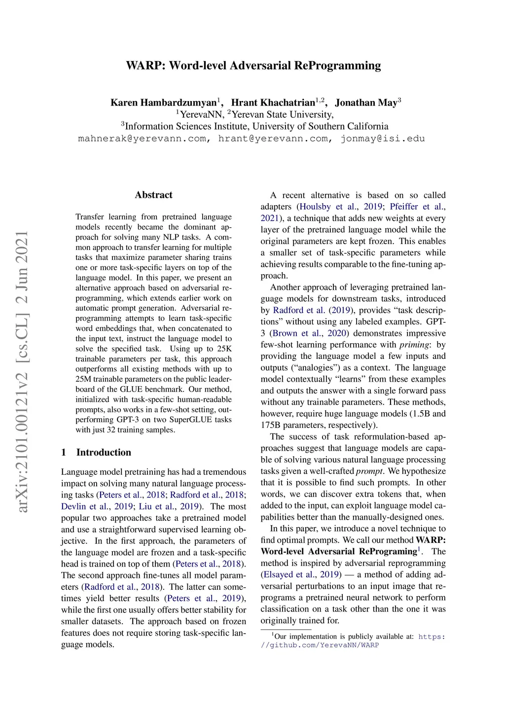 Transfer learning from pretrained language models recently became the dominant approach for solving many NLP tasks. A common approach to transfer learning for multiple tasks that maximize parameter sharing trains one or more task-specific layers on top of the language model. In this paper, we present an alternative approach based on adversarial reprogramming, which extends earlier work on automatic prompt generation. Adversarial reprogramming attempts to learn task-specific word embeddings that, when concatenated to the input text, instruct the language model to solve the specified task. Using up to 25K trainable parameters per task, this approach outperforms all existing methods with up to 25M trainable parameters on the public leaderboard of the GLUE benchmark. Our method, initialized with task-specific human-readable prompts, also works in a few-shot setting, outperforming GPT-3 on two SuperGLUE tasks with just 32 training samples.