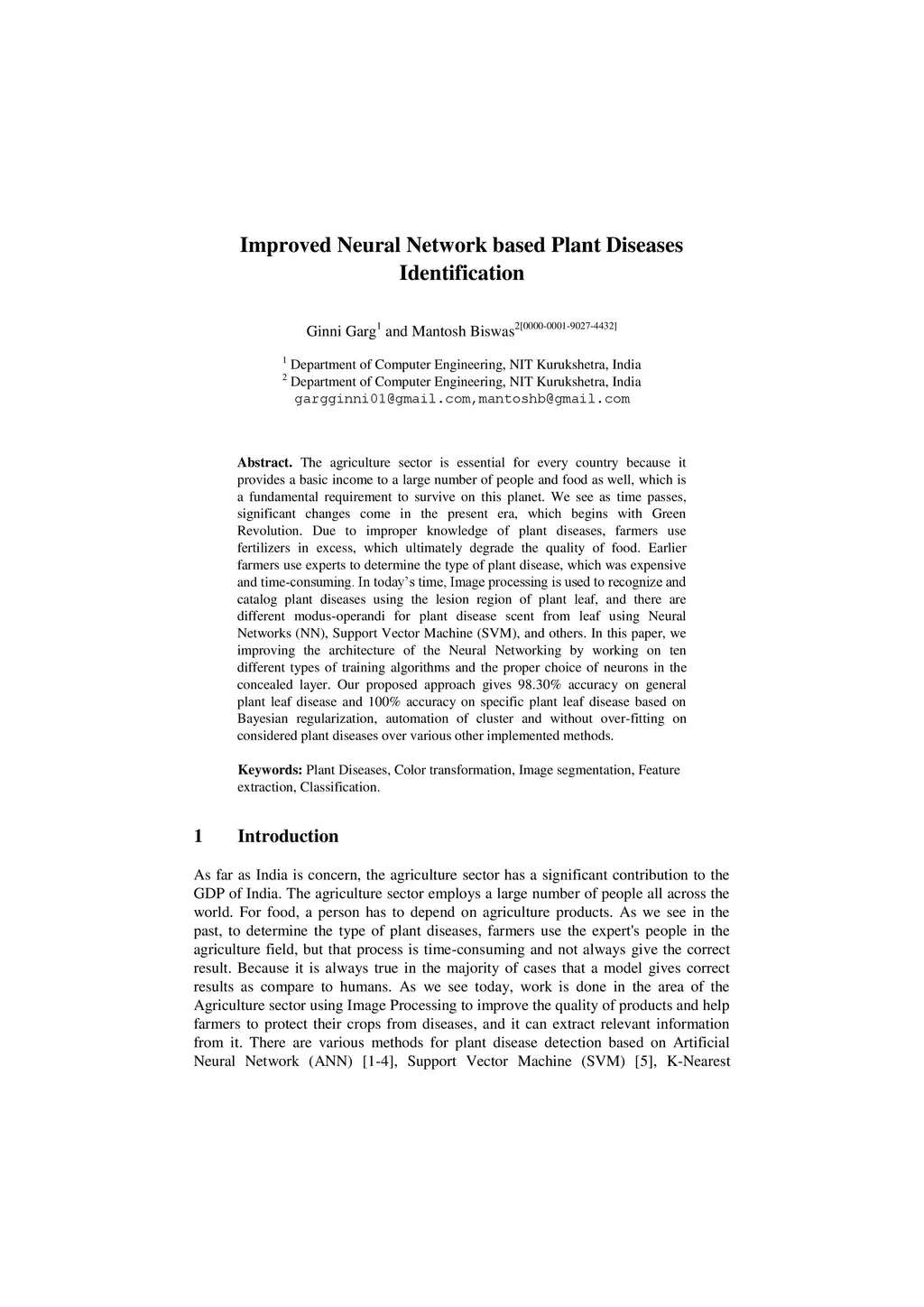 The agriculture sector is essential for every country because it provides a basic income to a large number of people and food as well, which is a fundamental requirement to survive on this planet. We see as time passes, significant changes come in the present era, which begins with Green Revolution. Due to improper knowledge of plant diseases, farmers use fertilizers in excess, which ultimately degrade the quality of food. Earlier farmers use experts to determine the type of plant disease, which was expensive and time-consuming. In today time, Image processing is used to recognize and catalog plant diseases using the lesion region of plant leaf, and there are different modus-operandi for plant disease scent from leaf using Neural Networks (NN), Support Vector Machine (SVM), and others. In this paper, we improving the architecture of the Neural Networking by working on ten different types of training algorithms and the proper choice of neurons in the concealed layer. Our proposed approach gives 98.30% accuracy on general plant leaf disease and 100% accuracy on specific plant leaf disease based on Bayesian regularization, automation of cluster and without over-fitting on considered plant diseases over various other implemented methods.