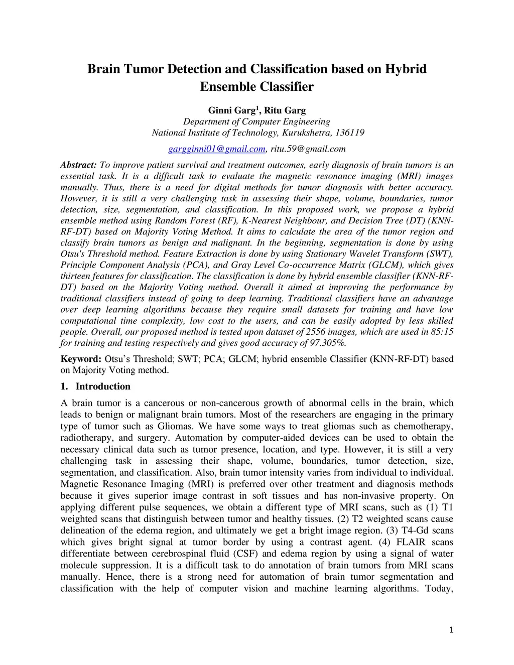 To improve patient survival and treatment outcomes, early diagnosis of brain tumors is an essential task. It is a difficult task to evaluate the magnetic resonance imaging (MRI) images manually. Thus, there is a need for digital methods for tumor diagnosis with better accuracy. However, it is still a very challenging task in assessing their shape, volume, boundaries, tumor detection, size, segmentation, and classification. In this proposed work, we propose a hybrid ensemble method using Random Forest (RF), K-Nearest Neighbour, and Decision Tree (DT) (KNN-RF-DT) based on Majority Voting Method. It aims to calculate the area of the tumor region and classify brain tumors as benign and malignant. In the beginning, segmentation is done by using Otsu's Threshold method. Feature Extraction is done by using Stationary Wavelet Transform (SWT), Principle Component Analysis (PCA), and Gray Level Co-occurrence Matrix (GLCM), which gives thirteen features for classification. The classification is done by hybrid ensemble classifier (KNN-RF-DT) based on the Majority Voting method. Overall it aimed at improving the performance by traditional classifiers instead of going to deep learning. Traditional classifiers have an advantage over deep learning algorithms because they require small datasets for training and have low computational time complexity, low cost to the users, and can be easily adopted by less skilled people. Overall, our proposed method is tested upon dataset of 2556 images, which are used in 85:15 for training and testing respectively and gives good accuracy of 97.305%.
