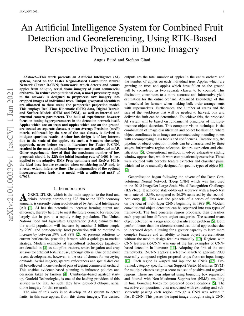 This work presents an Artificial Intelligence (AI) system, based on the Faster Region-Based Convolution Neural Network (Faster R-CNN) framework, which detects and counts apples from oblique, aerial drone imagery of giant commercial orchards. To reduce computational cost, a novel precursory stage to the network is designed to preprocess raw imagery into cropped images of individual trees. Unique geospatial identifiers are allocated to these using the perspective projection model. This employs Real-Time Kinematic (RTK) data, Digital Terrain and Surface Models (DTM and DSM), as well as internal and external camera parameters. The bulk of experiments however focus on tuning hyperparameters in the detection network itself. Apples which are on trees and apples which are on the ground are treated as separate classes. A mean Average Precision (mAP) metric, calibrated by the size of the two classes, is devised to mitigate spurious results. Anchor box design is of key interest due to the scale of the apples. As such, a k-means clustering approach, never before seen in literature for Faster R-CNN, resulted in the most significant improvements to calibrated mAP. Other experiments showed that the maximum number of box proposals should be 225; the initial learning rate of 0.001 is best applied to the adaptive RMS Prop optimiser; and ResNet 101 is the ideal base feature extractor when considering mAP and, to a lesser extent, inference time. The amalgamation of the optimal hyperparameters leads to a model with a calibrated mAP of 0.7627.