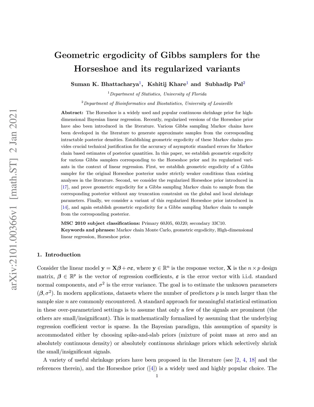 The Horseshoe is a widely used and popular continuous shrinkage prior for high-dimensional Bayesian linear regression. Recently, regularized versions of the Horseshoe prior have also been introduced in the literature. Various Gibbs sampling Markov chains have been developed in the literature to generate approximate samples from the corresponding intractable posterior densities. Establishing geometric ergodicity of these Markov chains provides crucial technical justification for the accuracy of asymptotic standard errors for Markov chain based estimates of posterior quantities. In this paper, we establish geometric ergodicity for various Gibbs samplers corresponding to the Horseshoe prior and its regularized variants in the context of linear regression. First, we establish geometric ergodicity of a Gibbs sampler for the original Horseshoe posterior under strictly weaker conditions than existing analyses in the literature. Second, we consider the regularized Horseshoe prior introduced in Piironen and Vehtari (2017), and prove geometric ergodicity for a Gibbs sampling Markov chain to sample from the corresponding posterior without any truncation constraint on the global and local shrinkage parameters. Finally, we consider a variant of this regularized Horseshoe prior introduced in Nishimura and Suchard (2020), and again establish geometric ergodicity for a Gibbs sampling Markov chain to sample from the corresponding posterior.