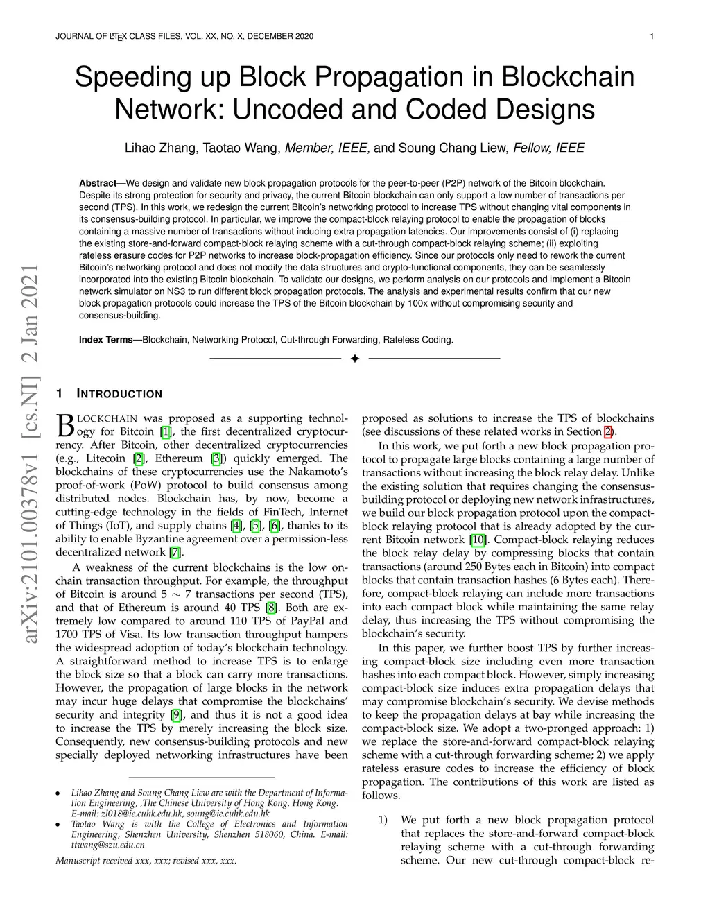 We design and validate new block propagation protocols for the peer-to-peer (P2P) network of the Bitcoin blockchain. Despite its strong protection for security and privacy, the current Bitcoin blockchain can only support a low number of transactions per second (TPS). In this work, we redesign the current Bitcoin's networking protocol to increase TPS without changing vital components in its consensus-building protocol. In particular, we improve the compact-block relaying protocol to enable the propagation of blocks containing a massive number of transactions without inducing extra propagation latencies. Our improvements consist of (i) replacing the existing store-and-forward compact-block relaying scheme with a cut-through compact-block relaying scheme; (ii) exploiting rateless erasure codes for P2P networks to increase block-propagation efficiency. Since our protocols only need to rework the current Bitcoin's networking protocol and does not modify the data structures and crypto-functional components, they can be seamlessly incorporated into the existing Bitcoin blockchain. To validate our designs, we perform analysis on our protocols and implement a Bitcoin network simulator on NS3 to run different block propagation protocols. The analysis and experimental results confirm that our new block propagation protocols could increase the TPS of the Bitcoin blockchain by 100x without compromising security and consensus-building.
