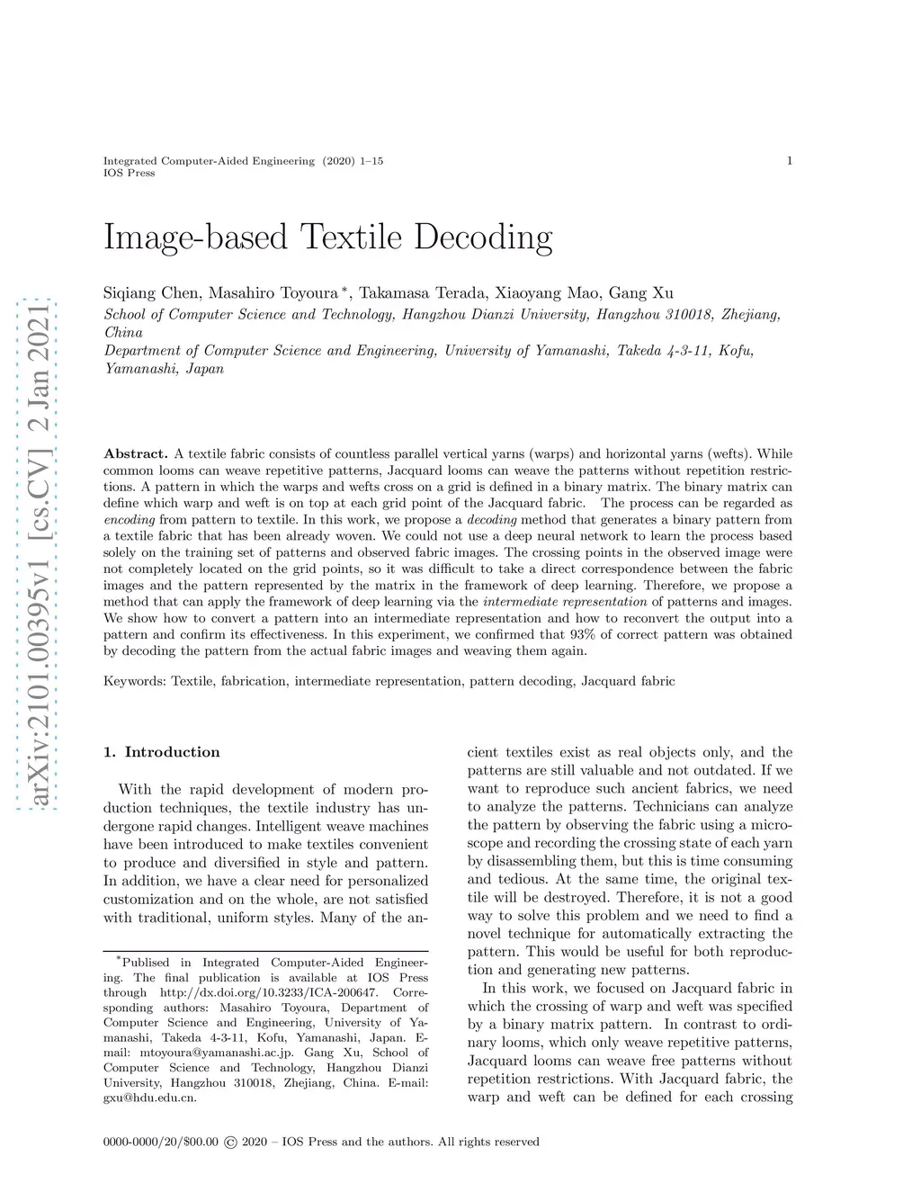 A textile fabric consists of countless parallel vertical yarns (warps) and horizontal yarns (wefts). While common looms can weave repetitive patterns, Jacquard looms can weave the patterns without repetition restrictions. A pattern in which the warps and wefts cross on a grid is defined in a binary matrix. The binary matrix can define which warp and weft is on top at each grid point of the Jacquard fabric. The process can be regarded as encoding from pattern to textile. In this work, we propose a decoding method that generates a binary pattern from a textile fabric that has been already woven. We could not use a deep neural network to learn the process based solely on the training set of patterns and observed fabric images. The crossing points in the observed image were not completely located on the grid points, so it was difficult to take a direct correspondence between the fabric images and the pattern represented by the matrix in the framework of deep learning. Therefore, we propose a method that can apply the framework of deep learning via the intermediate representation of patterns and images. We show how to convert a pattern into an intermediate representation and how to reconvert the output into a pattern and confirm its effectiveness. In this experiment, we confirmed that 93% of correct pattern was obtained by decoding the pattern from the actual fabric images and weaving them again.