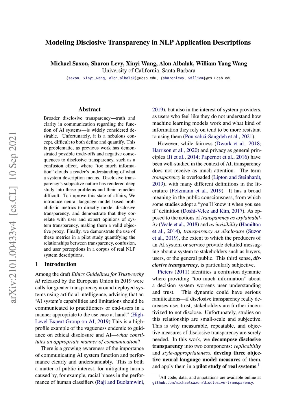 Modeling Discolsive Transparency in NLP Application Descriptions