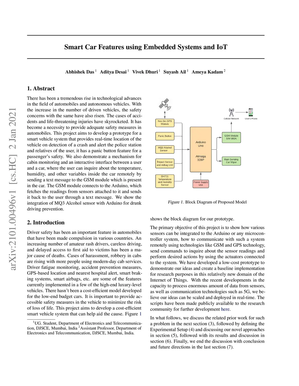 There has been a tremendous rise in technological advances in the field of automobiles and autonomous vehicles. With the increase in the number of driven vehicles, the safety concerns with the same have also risen. The cases of accidents and life-threatening injuries have skyrocketed. It has become a necessity to provide adequate safety measures in automobiles. This project aims to develop a prototype for a smart vehicle system that provides real-time location of the vehicle on detection of a crash and alert the police station and relatives of the user, it has a panic button feature for a passenger's safety. We also demonstrate a mechanism for cabin monitoring and an interactive interface between a user and a car, where the user can inquire about the temperature, humidity, and other variables inside the car remotely by sending a text message to the GSM module which is present in the car. The GSM module connects to the Arduino, which fetches the readings from sensors attached to it and sends it back to the user through a text message. We show the integration of MQ3 Alcohol sensor with Arduino for drunk driving prevention.