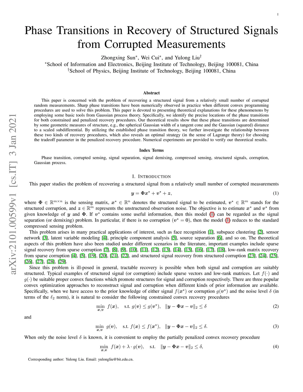 This paper is concerned with the problem of recovering a structured signal from a relatively small number of corrupted random measurements. Sharp phase transitions have been numerically observed in practice when different convex programming procedures are used to solve this problem. This paper is devoted to presenting theoretical explanations for these phenomenons by employing some basic tools from Gaussian process theory. Specifically, we identify the precise locations of the phase transitions for both constrained and penalized recovery procedures. Our theoretical results show that these phase transitions are determined by some geometric measures of structure, e.g., the spherical Gaussian width of a tangent cone and the Gaussian (squared) distance to a scaled subdifferential. By utilizing the established phase transition theory, we further investigate the relationship between these two kinds of recovery procedures, which also reveals an optimal strategy (in the sense of Lagrange theory) for choosing the tradeoff parameter in the penalized recovery procedure. Numerical experiments are provided to verify our theoretical results.