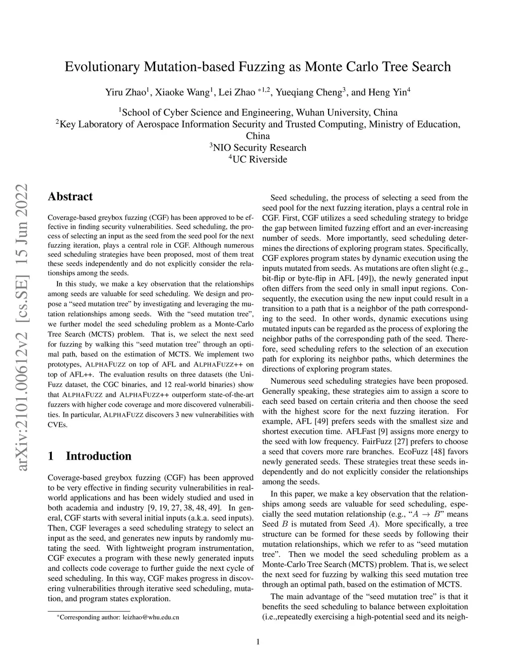 Coverage-based greybox fuzzing (CGF) has been approved to be effective in finding security vulnerabilities. Seed scheduling, the process of selecting an input as the seed from the seed pool for the next fuzzing iteration, plays a central role in CGF. Although numerous seed scheduling strategies have been proposed, most of them treat these seeds independently and do not explicitly consider the relationships among the seeds. In this study, we make a key observation that the relationships among seeds are valuable for seed scheduling. We design and propose a "seed mutation tree" by investigating and leveraging the mutation relationships among seeds. With the "seed mutation tree", we further model the seed scheduling problem as a Monte-Carlo Tree Search (MCTS) problem. That is, we select the next seed for fuzzing by walking this "seed mutation tree" through an optimal path, based on the estimation of MCTS. We implement two prototypes, AlphaFuzz on top of AFL and AlphaFuzz++ on top of AFL++. The evaluation results on three datasets (the UniFuzz dataset, the CGC binaries, and 12 real-world binaries) show that AlphaFuzz and AlphaFuzz++ outperform state-of-the-art fuzzers with higher code coverage and more discovered vulnerabilities. In particular, AlphaFuzz discovers 3 new vulnerabilities with CVEs.