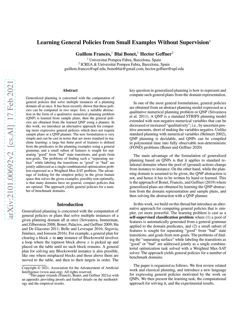 Learning General Policies from Small Examples Without Supervision