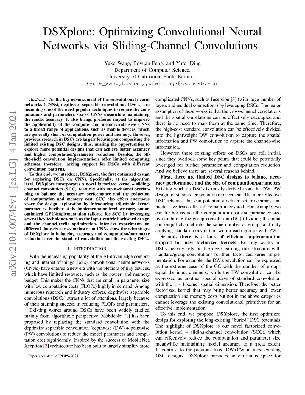 As the key advancement of the convolutional neural networks (CNNs), depthwise separable convolutions (DSCs) are becoming one of the most popular techniques to reduce the computations and parameters size of CNNs meanwhile maintaining the model accuracy. It also brings profound impact to improve the applicability of the compute- and memory-intensive CNNs to a broad range of applications, such as mobile devices, which are generally short of computation power and memory. However, previous research in DSCs are largely focusing on compositing the limited existing DSC designs, thus, missing the opportunities to explore more potential designs that can achieve better accuracy and higher computation/parameter reduction. Besides, the off-the-shelf convolution implementations offer limited computing schemes, therefore, lacking support for DSCs with different convolution patterns. To this end, we introduce, DSXplore, the first optimized design for exploring DSCs on CNNs. Specifically, at the algorithm level, DSXplore incorporates a novel factorized kernel -- sliding-channel convolution (SCC), featured with input-channel overlapping to balance the accuracy performance and the reduction of computation and memory cost. SCC also offers enormous space for design exploration by introducing adjustable kernel parameters. Further, at the implementation level, we carry out an optimized GPU-implementation tailored for SCC by leveraging several key techniques, such as the input-centric backward design and the channel-cyclic optimization. Intensive experiments on different datasets across mainstream CNNs show the advantages of DSXplore in balancing accuracy and computation/parameter reduction over the standard convolution and the existing DSCs.