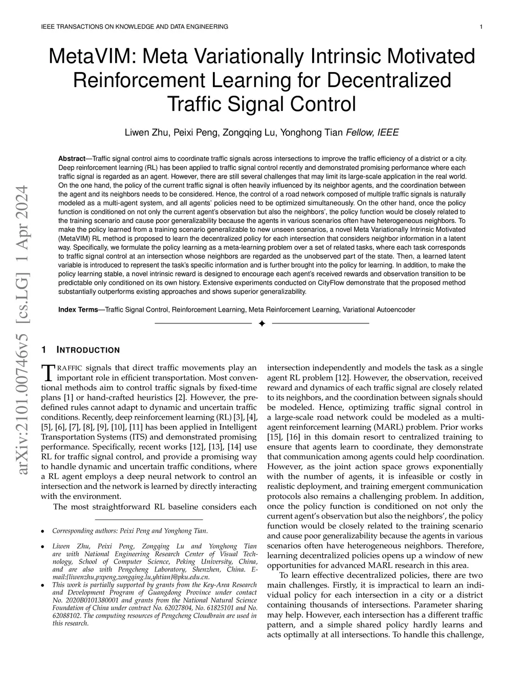 The goal of traffic signal control is to coordinate multiple traffic signals to improve the traffic efficiency of a district or a city. In this work, we propose a novel Meta Variationally Intrinsic Motivated (MetaVIM) RL method, and aim to learn the decentralized polices of each traffic signal only conditioned on its local observation. MetaVIM makes three novel contributions. Firstly, to make the model available to new unseen target scenarios, we formulate the traffic signal control as a meta-learning problem over a set of related tasks. The train scenario is divided as multiple partially observable Markov decision process (POMDP) tasks, and each task corresponds to a traffic light. In each task, the neighbours are regarded as an unobserved part of the state. Secondly, we assume that the reward, transition and policy functions vary across different tasks but share a common structure, and a learned latent variable conditioned on the past trajectories is proposed for each task to represent the specific information of the current task in these functions, then is further brought into policy for automatically trade off between exploration and exploitation to induce the RL agent to choose the reasonable action. In addition, to make the policy learning stable, four decoders are introduced to predict the received observations and rewards of the current agent with/without neighbour agents' policies, and a novel intrinsic reward is designed to encourage the received observation and reward invariant to the neighbour agents. Empirically, extensive experiments conducted on CityFlow demonstrate that the proposed method substantially outperforms existing methods and shows superior generalizability.
