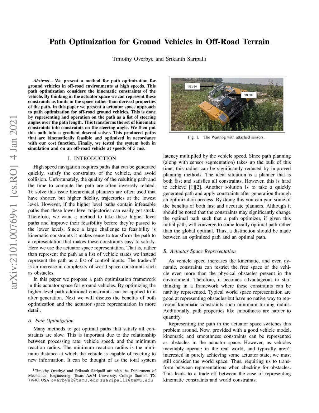 We present a method for path optimization for ground vehicles in off-road environments at high speeds. This path optimization considers the kinematic constraints of the vehicle. By thinking in the actuator space we can represent these constraints as limits in the space rather than derived properties of the path. In this paper we present a actuator space approach to path optimization for off-road ground vehicles. This is done by representing and operation on the path as a list of steering angles over the path length. This transforms the set of kinematic constraints into constraints on the steering angle. We then put this path into a gradient descent solver. This produced paths that are kinematically feasible and optimized in accordance with our cost function. Finally, we tested the system both in simulation and on an off-road vehicle at speeds of 5 m/s.