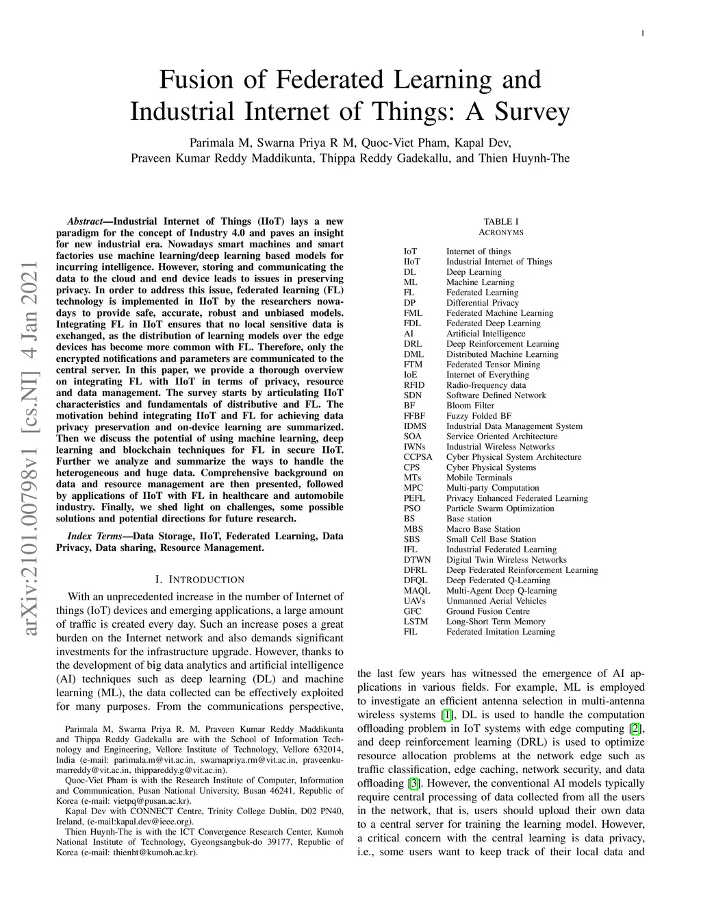 Industrial Internet of Things (IIoT) lays a new paradigm for the concept of Industry 4.0 and paves an insight for new industrial era. Nowadays smart machines and smart factories use machine learning/deep learning based models for incurring intelligence. However, storing and communicating the data to the cloud and end device leads to issues in preserving privacy. In order to address this issue, federated learning (FL) technology is implemented in IIoT by the researchers nowadays to provide safe, accurate, robust and unbiased models. Integrating FL in IIoT ensures that no local sensitive data is exchanged, as the distribution of learning models over the edge devices has become more common with FL. Therefore, only the encrypted notifications and parameters are communicated to the central server. In this paper, we provide a thorough overview on integrating FL with IIoT in terms of privacy, resource and data management. The survey starts by articulating IIoT characteristics and fundamentals of distributive and FL. The motivation behind integrating IIoT and FL for achieving data privacy preservation and on-device learning are summarized. Then we discuss the potential of using machine learning, deep learning and blockchain techniques for FL in secure IIoT. Further we analyze and summarize the ways to handle the heterogeneous and huge data. Comprehensive background on data and resource management are then presented, followed by applications of IIoT with FL in healthcare and automobile industry. Finally, we shed light on challenges, some possible solutions and potential directions for future research.