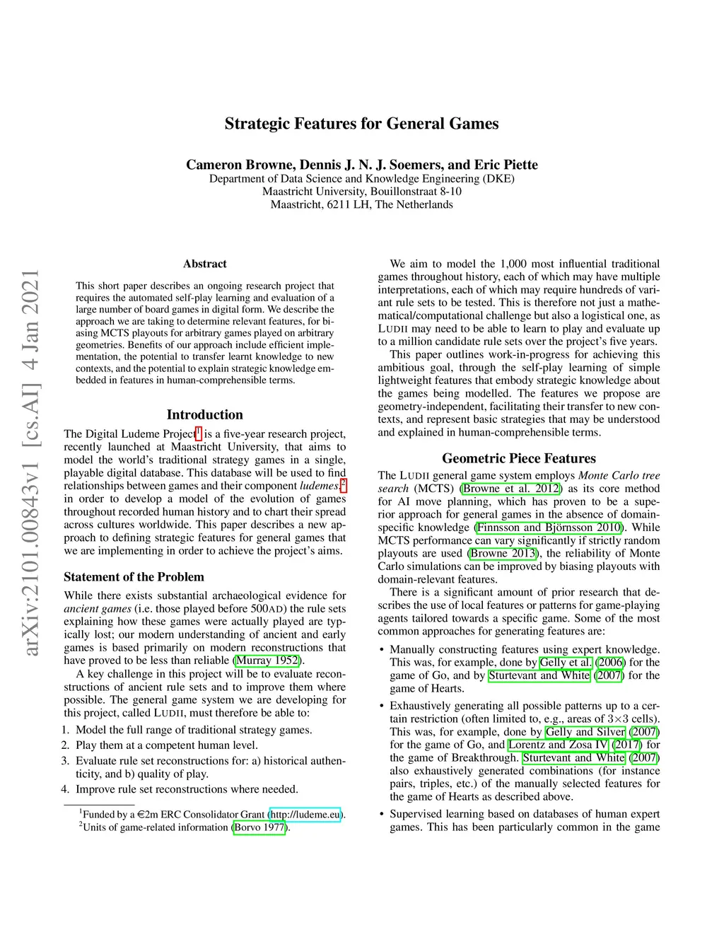 This short paper describes an ongoing research project that requires the automated self-play learning and evaluation of a large number of board games in digital form. We describe the approach we are taking to determine relevant features, for biasing MCTS playouts for arbitrary games played on arbitrary geometries. Benefits of our approach include efficient implementation, the potential to transfer learnt knowledge to new contexts, and the potential to explain strategic knowledge embedded in features in human-comprehensible terms.