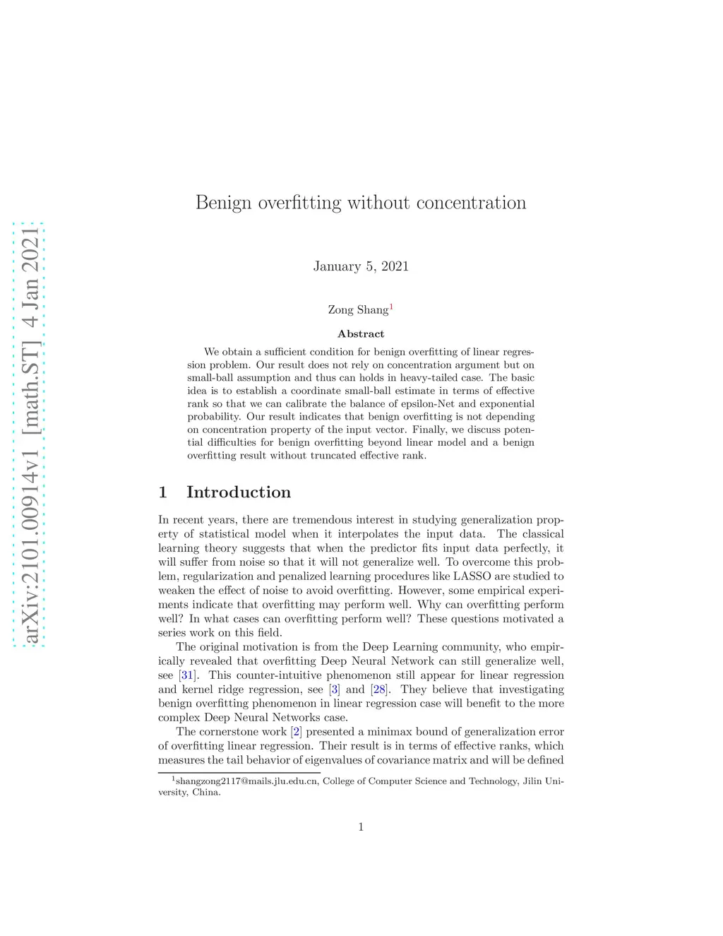 We obtain a sufficient condition for benign overfitting of linear regression problem. Our result does not rely on concentration argument but on small-ball assumption and thus can holds in heavy-tailed case. The basic idea is to establish a coordinate small-ball estimate in terms of effective rank so that we can calibrate the balance of epsilon-Net and exponential probability. Our result indicates that benign overfitting is not depending on concentration property of the input vector. Finally, we discuss potential difficulties for benign overfitting beyond linear model and a benign overfitting result without truncated effective rank.