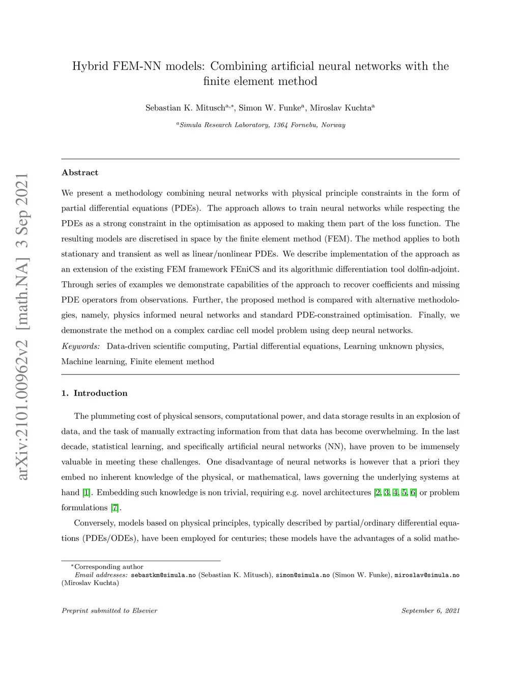 We present a methodology combining neural networks with physical principle constraints in the form of partial differential equations (PDEs). The approach allows to train neural networks while respecting the PDEs as a strong constraint in the optimisation as apposed to making them part of the loss function. The resulting models are discretised in space by the finite element method (FEM). The method applies to both stationary and transient as well as linear/nonlinear PDEs. We describe implementation of the approach as an extension of the existing FEM framework FEniCS and its algorithmic differentiation tool dolfin-adjoint. Through series of examples we demonstrate capabilities of the approach to recover coefficients and missing PDE operators from observations. Further, the proposed method is compared with alternative methodologies, namely, physics informed neural networks and standard PDE-constrained optimisation. Finally, we demonstrate the method on a complex cardiac cell model problem using deep neural networks.