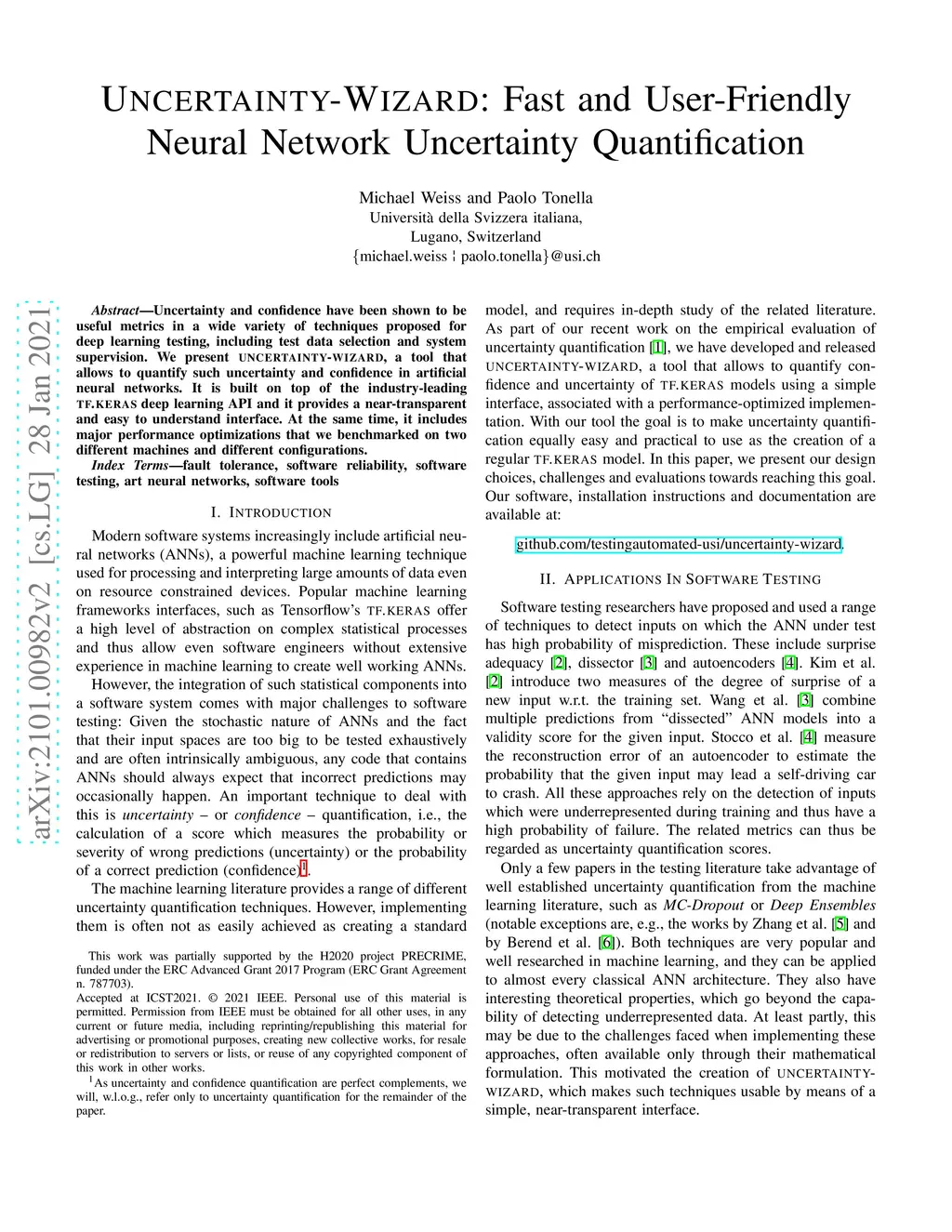 Uncertainty and confidence have been shown to be useful metrics in a wide variety of techniques proposed for deep learning testing, including test data selection and system supervision.We present uncertainty-wizard, a tool that allows to quantify such uncertainty and confidence in artificial neural networks. It is built on top of the industry-leading tf.keras deep learning API and it provides a near-transparent and easy to understand interface. At the same time, it includes major performance optimizations that we benchmarked on two different machines and different configurations.