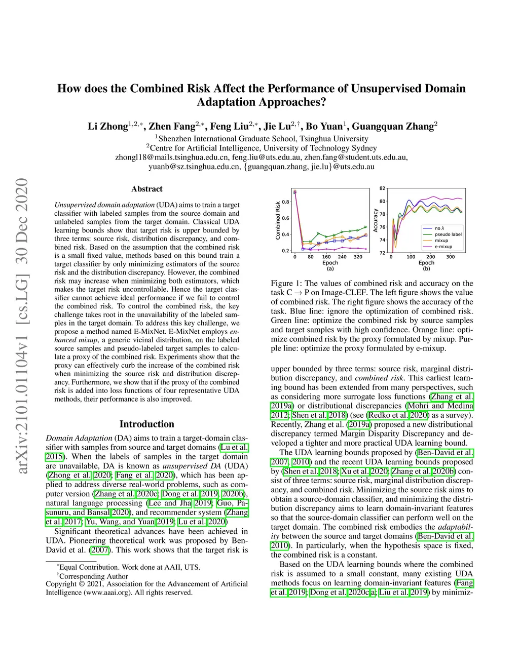Unsupervised domain adaptation (UDA) aims to train a target classifier with labeled samples from the source domain and unlabeled samples from the target domain. Classical UDA learning bounds show that target risk is upper bounded by three terms: source risk, distribution discrepancy, and combined risk. Based on the assumption that the combined risk is a small fixed value, methods based on this bound train a target classifier by only minimizing estimators of the source risk and the distribution discrepancy. However, the combined risk may increase when minimizing both estimators, which makes the target risk uncontrollable. Hence the target classifier cannot achieve ideal performance if we fail to control the combined risk. To control the combined risk, the key challenge takes root in the unavailability of the labeled samples in the target domain. To address this key challenge, we propose a method named E-MixNet. E-MixNet employs enhanced mixup, a generic vicinal distribution, on the labeled source samples and pseudo-labeled target samples to calculate a proxy of the combined risk. Experiments show that the proxy can effectively curb the increase of the combined risk when minimizing the source risk and distribution discrepancy. Furthermore, we show that if the proxy of the combined risk is added into loss functions of four representative UDA methods, their performance is also improved.