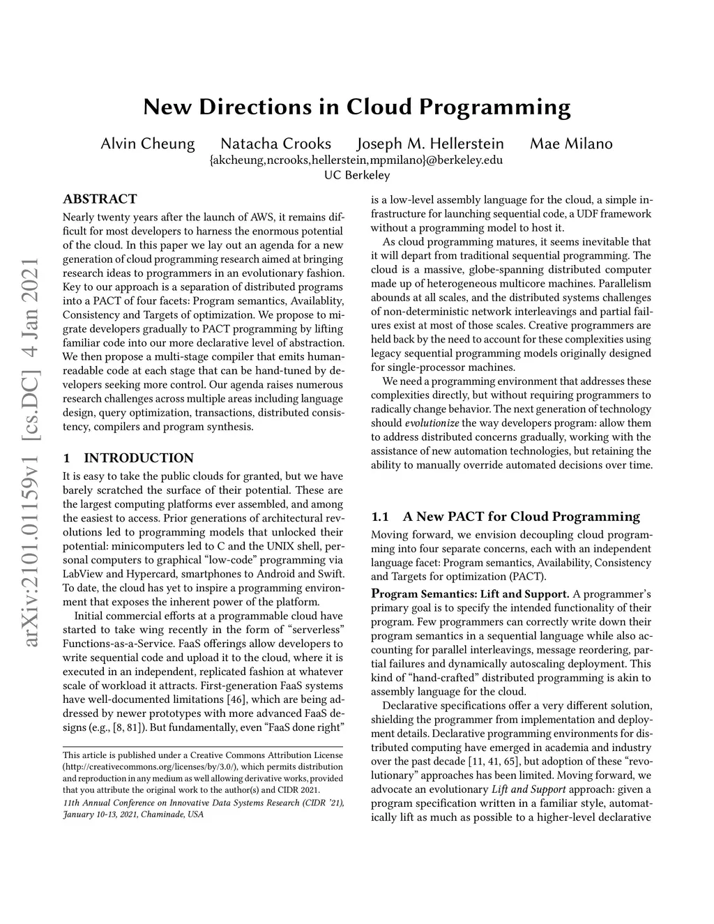 Nearly twenty years after the launch of AWS, it remains difficult for most developers to harness the enormous potential of the cloud. In this paper we lay out an agenda for a new generation of cloud programming research aimed at bringing research ideas to programmers in an evolutionary fashion. Key to our approach is a separation of distributed programs into a PACT of four facets: Program semantics, Availablity, Consistency and Targets of optimization. We propose to migrate developers gradually to PACT programming by lifting familiar code into our more declarative level of abstraction. We then propose a multi-stage compiler that emits human-readable code at each stage that can be hand-tuned by developers seeking more control. Our agenda raises numerous research challenges across multiple areas including language design, query optimization, transactions, distributed consistency, compilers and program synthesis.