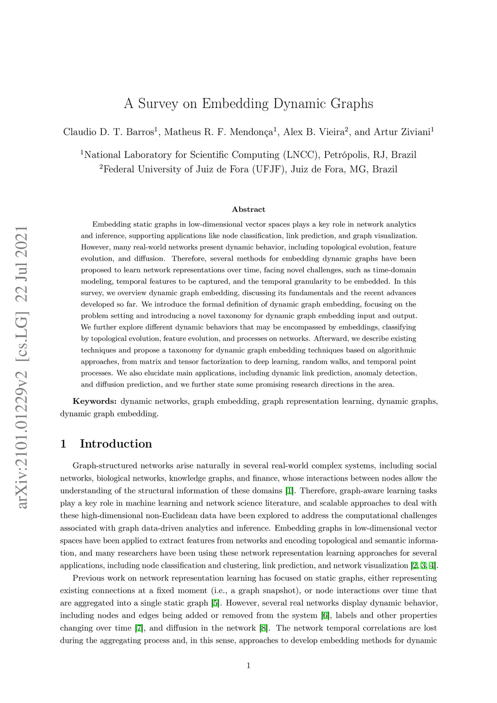 Embedding static graphs in low-dimensional vector spaces plays a key role in network analytics and inference, supporting applications like node classification, link prediction, and graph visualization. However, many real-world networks present dynamic behavior, including topological evolution, feature evolution, and diffusion. Therefore, several methods for embedding dynamic graphs have been proposed to learn network representations over time, facing novel challenges, such as time-domain modeling, temporal features to be captured, and the temporal granularity to be embedded. In this survey, we overview dynamic graph embedding, discussing its fundamentals and the recent advances developed so far. We introduce the formal definition of dynamic graph embedding, focusing on the problem setting and introducing a novel taxonomy for dynamic graph embedding input and output. We further explore different dynamic behaviors that may be encompassed by embeddings, classifying by topological evolution, feature evolution, and processes on networks. Afterward, we describe existing techniques and propose a taxonomy for dynamic graph embedding techniques based on algorithmic approaches, from matrix and tensor factorization to deep learning, random walks, and temporal point processes. We also elucidate main applications, including dynamic link prediction, anomaly detection, and diffusion prediction, and we further state some promising research directions in the area.