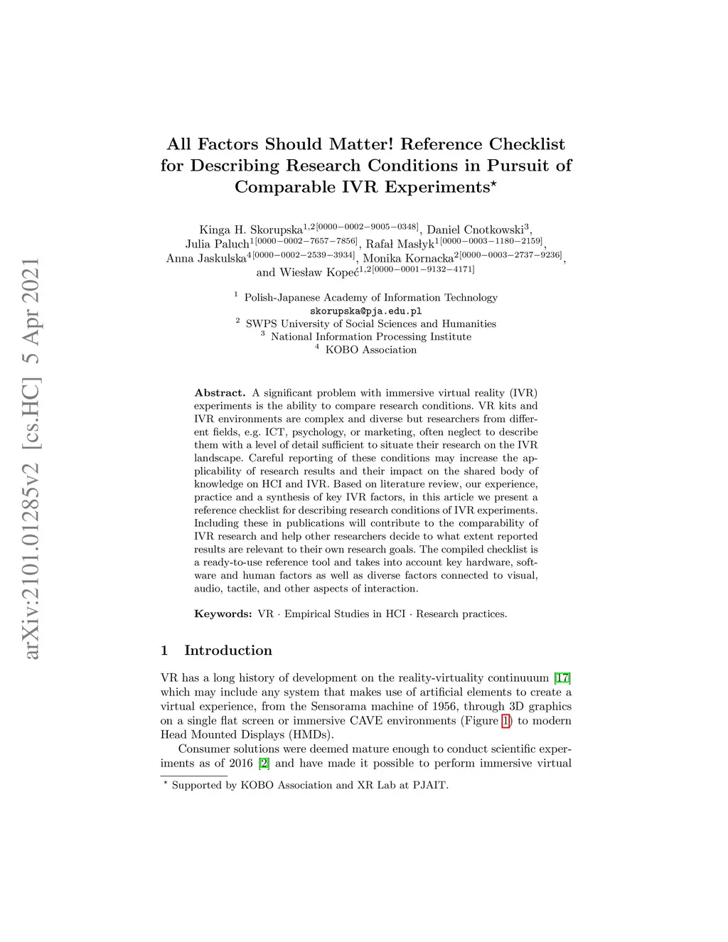 A significant problem with immersive virtual reality (IVR) experiments is the ability to compare research conditions. VR kits and IVR environments are complex and diverse but researchers from different fields, e.g. ICT, psychology, or marketing, often neglect to describe them with a level of detail sufficient to situate their research on the IVR landscape. Careful reporting of these conditions may increase the applicability of research results and their impact on the shared body of knowledge on HCI and IVR. Based on literature review, our experience, practice and a synthesis of key IVR factors, in this article we present a reference checklist for describing research conditions of IVR experiments. Including these in publications will contribute to the comparability of IVR research and help other researchers decide to what extent reported results are relevant to their own research goals. The compiled checklist is a ready-to-use reference tool and takes into account key hardware, software and human factors as well as diverse factors connected to visual, audio, tactile, and other aspects of interaction.
