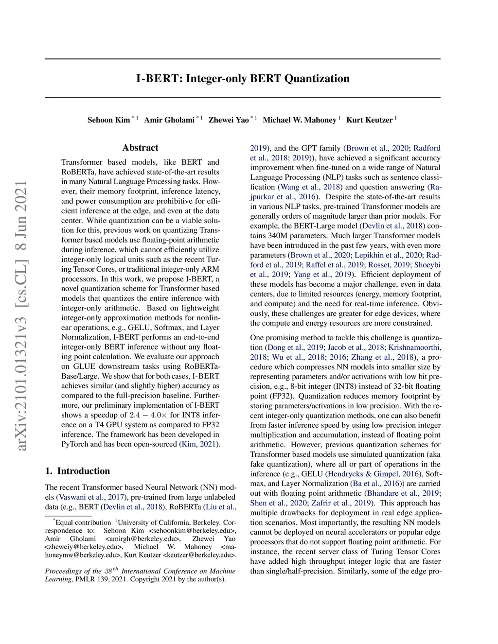 Transformer based models, like BERT and RoBERTa, have achieved state-of-the-art results in many Natural Language Processing tasks. However, their memory footprint, inference latency, and power consumption are prohibitive efficient inference at the edge, and even at the data center. While quantization can be a viable solution for this, previous work on quantizing Transformer based models use floating-point arithmetic during inference, which cannot efficiently utilize integer-only logical units such as the recent Turing Tensor Cores, or traditional integer-only ARM processors. In this work, we propose I-BERT, a novel quantization scheme for Transformer based models that quantizes the entire inference with integer-only arithmetic. Based on lightweight integer-only approximation methods for nonlinear operations, e.g., GELU, Softmax, and Layer Normalization, I-BERT performs an end-to-end integer-only BERT inference without any floating point calculation. We evaluate our approach on GLUE downstream tasks using RoBERTa-Base/Large. We show that for both cases, I-BERT achieves similar (and slightly higher) accuracy as compared to the full-precision baseline. Furthermore, our preliminary implementation of I-BERT shows a speedup of 2.4-4.0x for INT8 inference on a T4 GPU system as compared to FP32 inference. The framework has been developed in PyTorch and has been open-sourced.