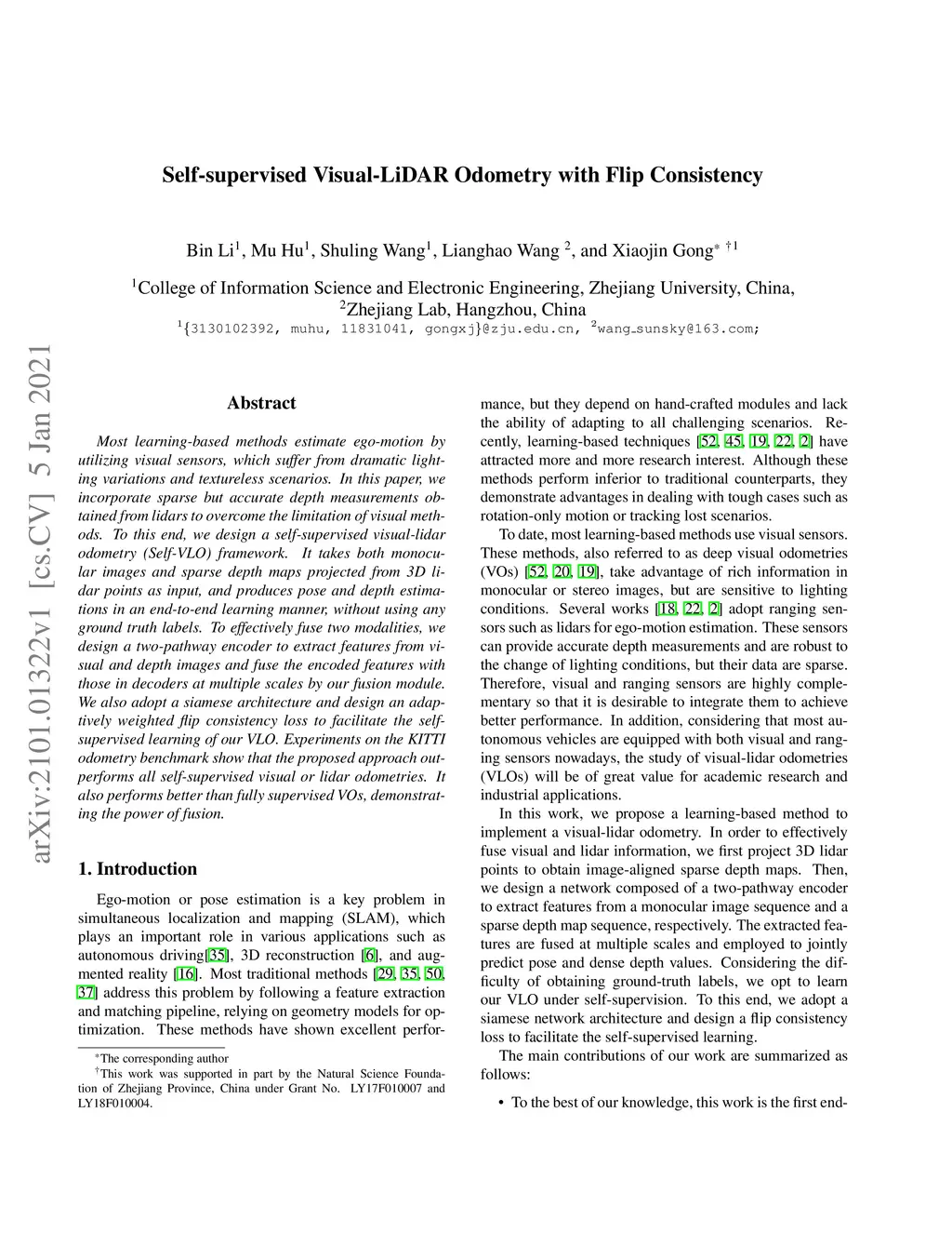 Most learning-based methods estimate ego-motion by utilizing visual sensors, which suffer from dramatic lighting variations and textureless scenarios. In this paper, we incorporate sparse but accurate depth measurements obtained from lidars to overcome the limitation of visual methods. To this end, we design a self-supervised visual-lidar odometry (Self-VLO) framework. It takes both monocular images and sparse depth maps projected from 3D lidar points as input, and produces pose and depth estimations in an end-to-end learning manner, without using any ground truth labels. To effectively fuse two modalities, we design a two-pathway encoder to extract features from visual and depth images and fuse the encoded features with those in decoders at multiple scales by our fusion module. We also adopt a siamese architecture and design an adaptively weighted flip consistency loss to facilitate the self-supervised learning of our VLO. Experiments on the KITTI odometry benchmark show that the proposed approach outperforms all self-supervised visual or lidar odometries. It also performs better than fully supervised VOs, demonstrating the power of fusion.