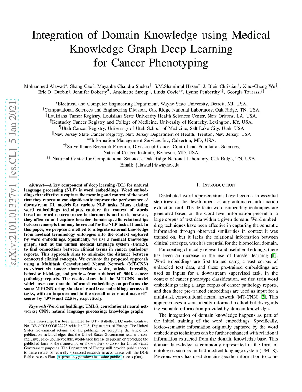 A key component of deep learning (DL) for natural language processing (NLP) is word embeddings. Word embeddings that effectively capture the meaning and context of the word that they represent can significantly improve the performance of downstream DL models for various NLP tasks. Many existing word embeddings techniques capture the context of words based on word co-occurrence in documents and text; however, they often cannot capture broader domain-specific relationships between concepts that may be crucial for the NLP task at hand. In this paper, we propose a method to integrate external knowledge from medical terminology ontologies into the context captured by word embeddings. Specifically, we use a medical knowledge graph, such as the unified medical language system (UMLS), to find connections between clinical terms in cancer pathology reports. This approach aims to minimize the distance between connected clinical concepts. We evaluate the proposed approach using a Multitask Convolutional Neural Network (MT-CNN) to extract six cancer characteristics -- site, subsite, laterality, behavior, histology, and grade -- from a dataset of ~900K cancer pathology reports. The results show that the MT-CNN model which uses our domain informed embeddings outperforms the same MT-CNN using standard word2vec embeddings across all tasks, with an improvement in the overall micro- and macro-F1 scores by 4.97\%and 22.5\%, respectively.