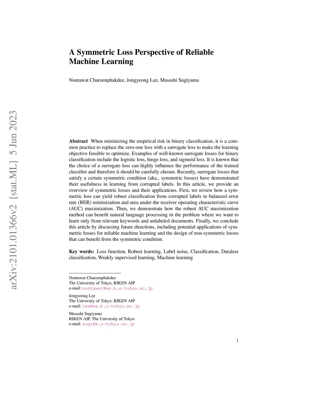 When minimizing the empirical risk in binary classification, it is a common practice to replace the zero-one loss with a surrogate loss to make the learning objective feasible to optimize. Examples of well-known surrogate losses for binary classification include the logistic loss, hinge loss, and sigmoid loss. It is known that the choice of a surrogate loss can highly influence the performance of the trained classifier and therefore it should be carefully chosen. Recently, surrogate losses that satisfy a certain symmetric condition (aka., symmetric losses) have demonstrated their usefulness in learning from corrupted labels. In this article, we provide an overview of symmetric losses and their applications. First, we review how a symmetric loss can yield robust classification from corrupted labels in balanced error rate (BER) minimization and area under the receiver operating characteristic curve (AUC) maximization. Then, we demonstrate how the robust AUC maximization method can benefit natural language processing in the problem where we want to learn only from relevant keywords and unlabeled documents. Finally, we conclude this article by discussing future directions, including potential applications of symmetric losses for reliable machine learning and the design of non-symmetric losses that can benefit from the symmetric condition.