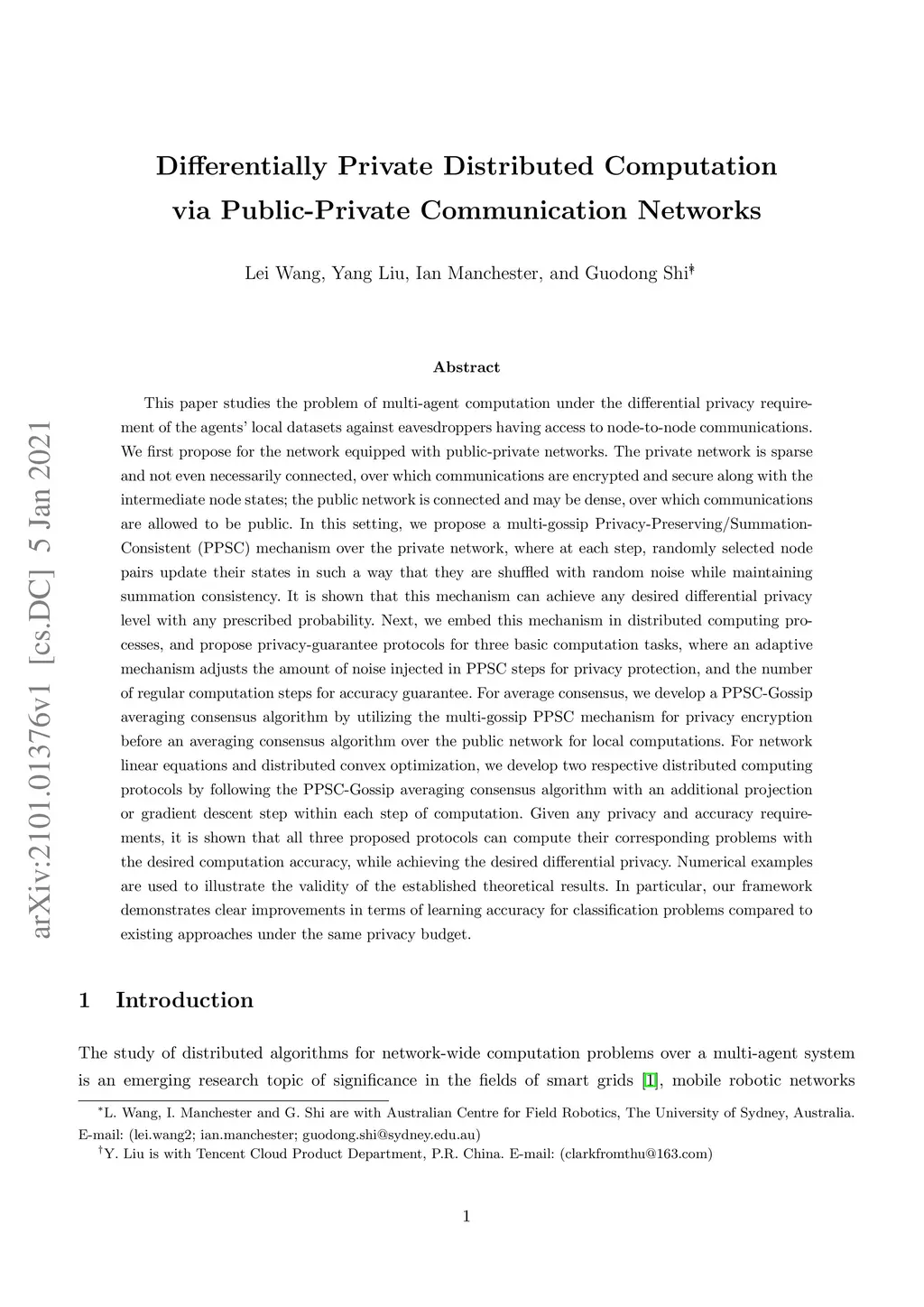 This paper studies the problem of multi-agent computation under the differential privacy requirement of the agents' local datasets against eavesdroppers having node-to-node communications. We first propose for the network equipped with public-private networks. The private network is sparse and not even necessarily connected, over which communications are encrypted and secure along with the intermediate node states; the public network is connected and may be dense, over which communications are allowed to be public. In this setting, we propose a multi-gossip PPSC mechanism over the private network, where at each step, randomly selected node pairs update their states in such a way that they are shuffled with random noise while maintaining summation consistency. We show that this mechanism can achieve any desired differential privacy level with any prescribed probability. Next, we embed this mechanism in distributed computing processes, and propose privacy-guarantee protocols for three basic computation tasks, where an adaptive mechanism adjusts the amount of noise injected in PPSC steps for privacy protection, and the number of regular computation steps for accuracy guarantee. For average consensus, we develop a PPSC-Gossip averaging consensus algorithm by utilizing the multi-gossip PPSC mechanism for privacy encryption before an averaging consensus algorithm over the public network for local computations. For network linear equations and distributed convex optimization, we develop two respective distributed computing protocols by following the PPSC-Gossip averaging consensus algorithm with an additional projection or gradient descent step within each step of computation. Given any privacy and accuracy requirements, it is shown that all three proposed protocols can compute their corresponding problems with the desired computation accuracy, while achieving the desired differential privacy.