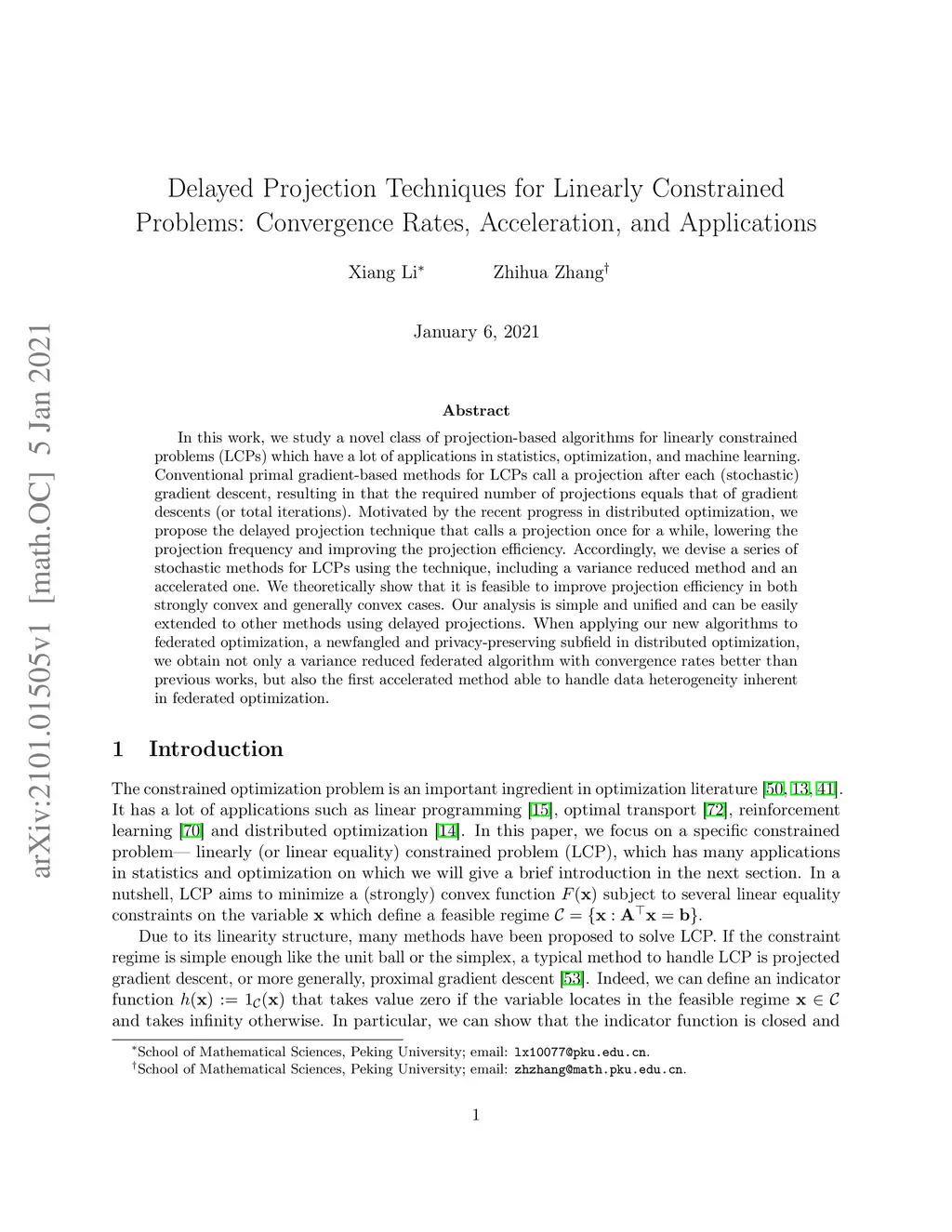 In this work, we study a novel class of projection-based algorithms for linearly constrained problems (LCPs) which have a lot of applications in statistics, optimization, and machine learning. Conventional primal gradient-based methods for LCPs call a projection after each (stochastic) gradient descent, resulting in that the required number of projections equals that of gradient descents (or total iterations). Motivated by the recent progress in distributed optimization, we propose the delayed projection technique that calls a projection once for a while, lowering the projection frequency and improving the projection efficiency. Accordingly, we devise a series of stochastic methods for LCPs using the technique, including a variance reduced method and an accelerated one. We theoretically show that it is feasible to improve projection efficiency in both strongly convex and generally convex cases. Our analysis is simple and unified and can be easily extended to other methods using delayed projections. When applying our new algorithms to federated optimization, a newfangled and privacy-preserving subfield in distributed optimization, we obtain not only a variance reduced federated algorithm with convergence rates better than previous works, but also the first accelerated method able to handle data heterogeneity inherent in federated optimization.