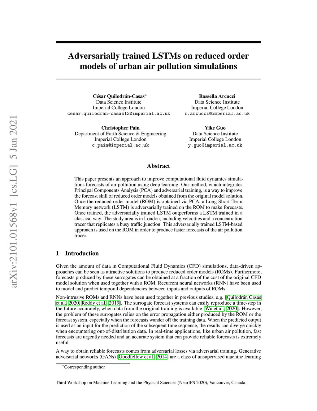 This paper presents an approach to improve computational fluid dynamics simulations forecasts of air pollution using deep learning. Our method, which integrates Principal Components Analysis (PCA) and adversarial training, is a way to improve the forecast skill of reduced order models obtained from the original model solution. Once the reduced-order model (ROM) is obtained via PCA, a Long Short-Term Memory network (LSTM) is adversarially trained on the ROM to make forecasts. Once trained, the adversarially trained LSTM outperforms a LSTM trained in a classical way. The study area is in London, including velocities and a concentration tracer that replicates a busy traffic junction. This adversarially trained LSTM-based approach is used on the ROM in order to produce faster forecasts of the air pollution tracer.