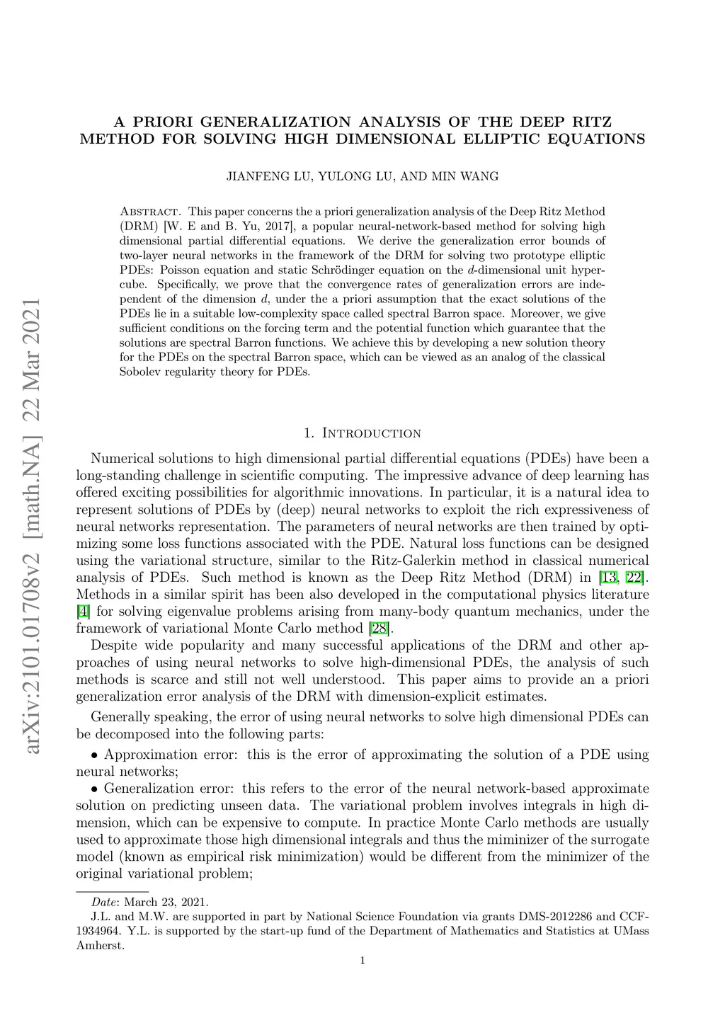 This paper concerns the a priori generalization analysis of the Deep Ritz Method (DRM) [W. E and B. Yu, 2017], a popular neural-network-based method for solving high dimensional partial differential equations. We derive the generalization error bounds of two-layer neural networks in the framework of the DRM for solving two prototype elliptic PDEs: Poisson equation and static Schr\"odinger equation on the -dimensional unit hypercube. Specifically, we prove that the convergence rates of generalization errors are independent of the dimension , under the a priori assumption that the exact solutions of the PDEs lie in a suitable low-complexity space called spectral Barron space. Moreover, we give sufficient conditions on the forcing term and the potential function which guarantee that the solutions are spectral Barron functions. We achieve this by developing a new solution theory for the PDEs on the spectral Barron space, which can be viewed as an analog of the classical Sobolev regularity theory for PDEs.