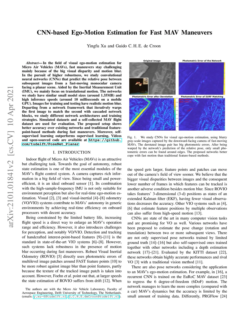In the field of visual ego-motion estimation for Micro Air Vehicles (MAVs), fast maneuvers stay challenging mainly because of the big visual disparity and motion blur. In the pursuit of higher robustness, we study convolutional neural networks (CNNs) that predict the relative pose between subsequent images from a fast-moving monocular camera facing a planar scene. Aided by the Inertial Measurement Unit (IMU), we mainly focus on translational motion. The networks we study have similar small model sizes (around 1.35MB) and high inference speeds (around 10 milliseconds on a mobile GPU). Images for training and testing have realistic motion blur. Departing from a network framework that iteratively warps the first image to match the second with cascaded network blocks, we study different network architectures and training strategies. Simulated datasets and a self-collected MAV flight dataset are used for evaluation. The proposed setup shows better accuracy over existing networks and traditional feature-point-based methods during fast maneuvers. Moreover, self-supervised learning outperforms supervised learning. Videos and open-sourced code are available at https://github.com/tudelft/PoseNet_Planar