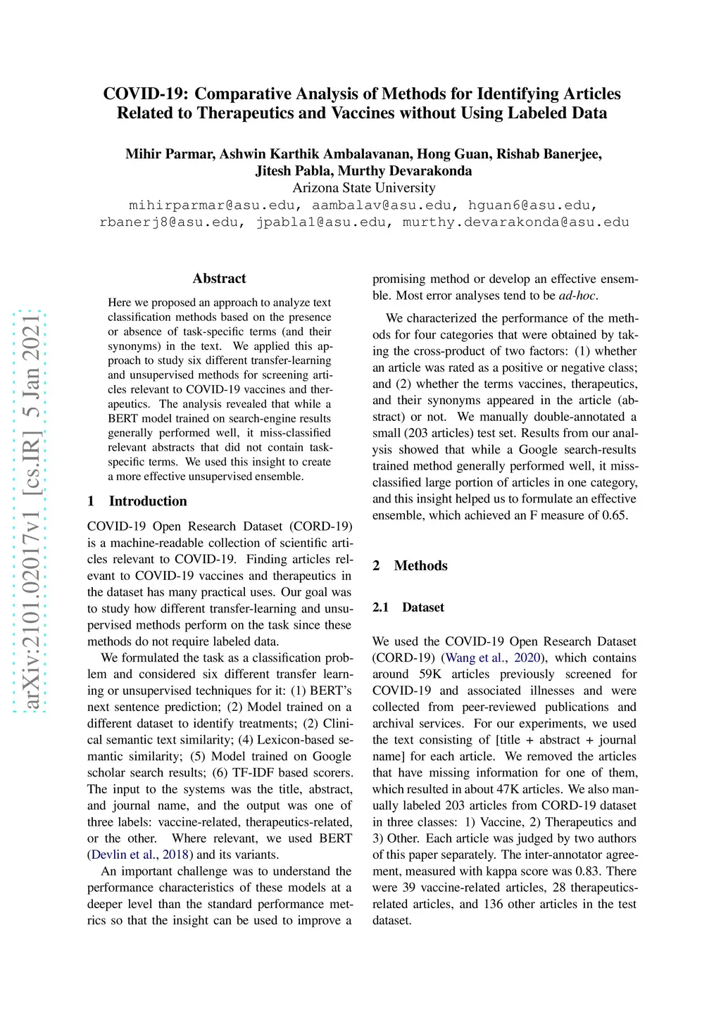 Here we proposed an approach to analyze text classification methods based on the presence or absence of task-specific terms (and their synonyms) in the text. We applied this approach to study six different transfer-learning and unsupervised methods for screening articles relevant to COVID-19 vaccines and therapeutics. The analysis revealed that while a BERT model trained on search-engine results generally performed well, it miss-classified relevant abstracts that did not contain task-specific terms. We used this insight to create a more effective unsupervised ensemble.