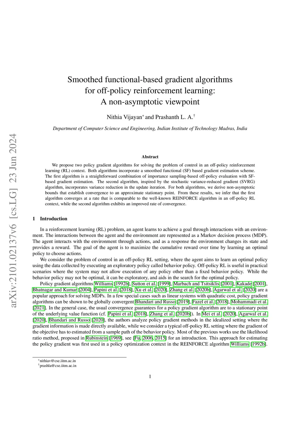 We propose two policy gradient algorithms for solving the problem of control in an off-policy reinforcement learning (RL) context. Both algorithms incorporate a smoothed functional (SF) based gradient estimation scheme. The first algorithm is a straightforward combination of importance sampling-based off-policy evaluation with SF-based gradient estimation. The second algorithm, inspired by the stochastic variance-reduced gradient (SVRG) algorithm, incorporates variance reduction in the update iteration. For both algorithms, we derive non-asymptotic bounds that establish convergence to an approximate stationary point. From these results, we infer that the first algorithm converges at a rate that is comparable to the well-known REINFORCE algorithm in an off-policy RL context, while the second algorithm exhibits an improved rate of convergence.