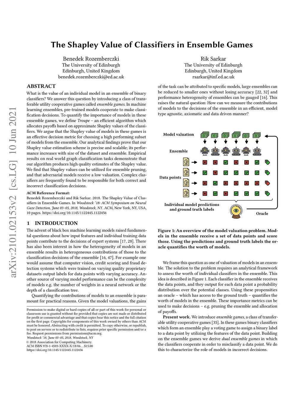 What is the value of an individual model in an ensemble of binary classifiers? We answer this question by introducing a class of transferable utility cooperative games called \textit{ensemble games}. In machine learning ensembles, pre-trained models cooperate to make classification decisions. To quantify the importance of models in these ensemble games, we define \textit{Troupe} -- an efficient algorithm which allocates payoffs based on approximate Shapley values of the classifiers. We argue that the Shapley value of models in these games is an effective decision metric for choosing a high performing subset of models from the ensemble. Our analytical findings prove that our Shapley value estimation scheme is precise and scalable; its performance increases with size of the dataset and ensemble. Empirical results on real world graph classification tasks demonstrate that our algorithm produces high quality estimates of the Shapley value. We find that Shapley values can be utilized for ensemble pruning, and that adversarial models receive a low valuation. Complex classifiers are frequently found to be responsible for both correct and incorrect classification decisions.