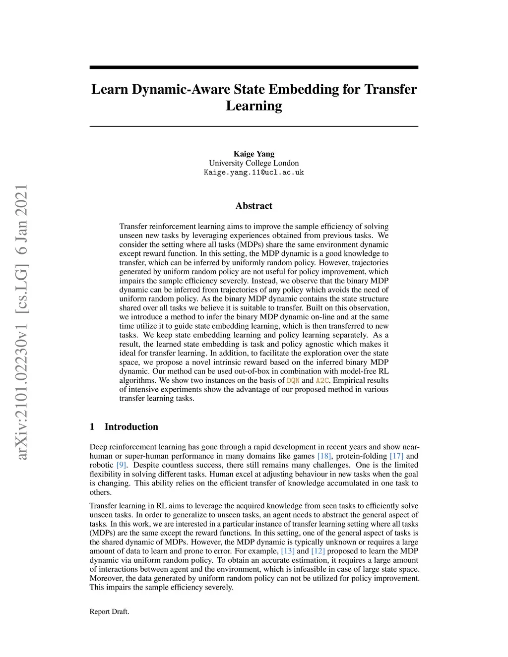 Transfer reinforcement learning aims to improve the sample efficiency of solving unseen new tasks by leveraging experiences obtained from previous tasks. We consider the setting where all tasks (MDPs) share the same environment dynamic except reward function. In this setting, the MDP dynamic is a good knowledge to transfer, which can be inferred by uniformly random policy. However, trajectories generated by uniform random policy are not useful for policy improvement, which impairs the sample efficiency severely. Instead, we observe that the binary MDP dynamic can be inferred from trajectories of any policy which avoids the need of uniform random policy. As the binary MDP dynamic contains the state structure shared over all tasks we believe it is suitable to transfer. Built on this observation, we introduce a method to infer the binary MDP dynamic on-line and at the same time utilize it to guide state embedding learning, which is then transferred to new tasks. We keep state embedding learning and policy learning separately. As a result, the learned state embedding is task and policy agnostic which makes it ideal for transfer learning. In addition, to facilitate the exploration over the state space, we propose a novel intrinsic reward based on the inferred binary MDP dynamic. Our method can be used out-of-box in combination with model-free RL algorithms. We show two instances on the basis of \algo{DQN} and \algo{A2C}. Empirical results of intensive experiments show the advantage of our proposed method in various transfer learning tasks.