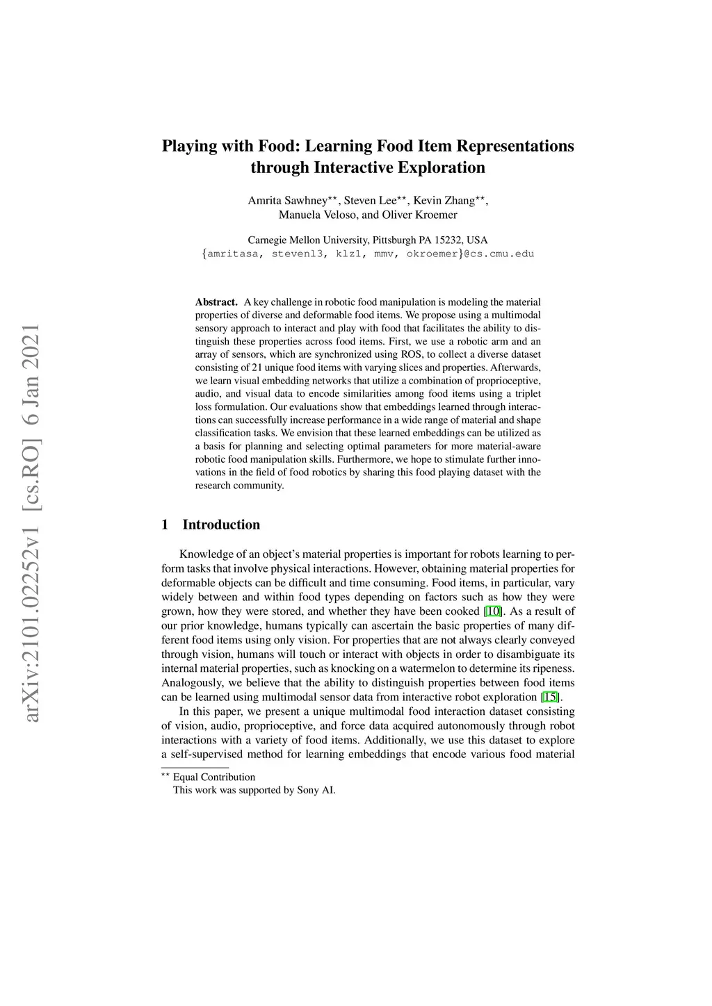 A key challenge in robotic food manipulation is modeling the material properties of diverse and deformable food items. We propose using a multimodal sensory approach to interact and play with food that facilitates the ability to distinguish these properties across food items. First, we use a robotic arm and an array of sensors, which are synchronized using ROS, to collect a diverse dataset consisting of 21 unique food items with varying slices and properties. Afterwards, we learn visual embedding networks that utilize a combination of proprioceptive, audio, and visual data to encode similarities among food items using a triplet loss formulation. Our evaluations show that embeddings learned through interactions can successfully increase performance in a wide range of material and shape classification tasks. We envision that these learned embeddings can be utilized as a basis for planning and selecting optimal parameters for more material-aware robotic food manipulation skills. Furthermore, we hope to stimulate further innovations in the field of food robotics by sharing this food playing dataset with the research community.