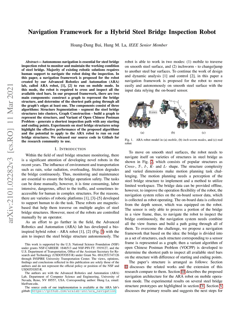 Autonomous navigation is essential for steel bridge inspection robot to monitor and maintain the working condition of steel bridges. Majority of existing robotic solutions requires human support to navigate the robot doing the inspection. In this paper, a navigation framework is proposed for ARA robot [1], [2] to run on mobile mode. In this mode, the robot needs to cross and inspect all the available steel bars. The most significant contributions of this research are four algorithms, which can process the depth data, segment it into clusters, estimate the boundaries, construct a graph to represent the structure, generate a shortest inspection path with any starting and ending points, and determine available robot configuration for path planning. Experiments on steel bridge structures setup highlight the effective performance of the algorithms, and the potential to apply to the ARA robot to run on real bridge structures. We released our source code in Github for the research community to use.