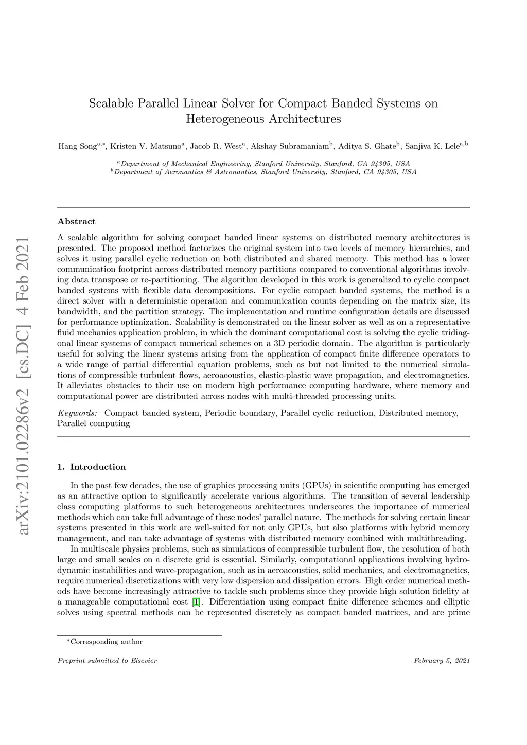A scalable algorithm for solving compact banded linear systems on distributed memory architectures is presented. The proposed method factorizes the original system into two levels of memory hierarchies, and solves it using parallel cyclic reduction on both distributed and shared memory. This method has a lower communication footprint across distributed memory partitions compared to conventional algorithms involving data transpose or re-partitioning. The algorithm developed in this work is generalized to cyclic compact banded systems with flexible data decompositions. For cyclic compact banded systems, the method is a direct solver with a deterministic operation and communication counts depending on the matrix size, its bandwidth, and the partition strategy. The implementation and runtime configuration details are discussed for performance optimization. Scalability is demonstrated on the linear solver as well as on a representative fluid mechanics application problem, in which the dominant computational cost is solving the cyclic tridiagonal linear systems of compact numerical schemes on a 3D periodic domain. The algorithm is particularly useful for solving the linear systems arising from the application of compact finite difference operators to a wide range of partial differential equation problems, such as but not limited to the numerical simulations of compressible turbulent flows, aeroacoustics, elastic-plastic wave propagation, and electromagnetics. It alleviates obstacles to their use on modern high performance computing hardware, where memory and computational power are distributed across nodes with multi-threaded processing units.