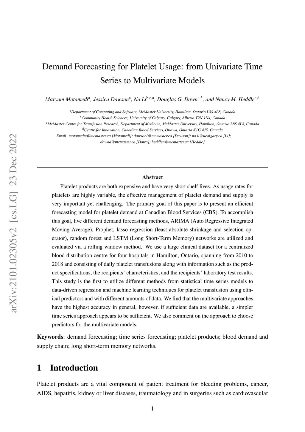 Platelet products are both expensive and have very short shelf lives. As usage rates for platelets are highly variable, the effective management of platelet demand and supply is very important yet challenging. The primary goal of this paper is to present an efficient forecasting model for platelet demand at Canadian Blood Services (CBS). To accomplish this goal, four different demand forecasting methods, ARIMA (Auto Regressive Moving Average), Prophet, lasso regression (least absolute shrinkage and selection operator) and LSTM (Long Short-Term Memory) networks are utilized and evaluated. We use a large clinical dataset for a centralized blood distribution centre for four hospitals in Hamilton, Ontario, spanning from 2010 to 2018 and consisting of daily platelet transfusions along with information such as the product specifications, the recipients' characteristics, and the recipients' laboratory test results. This study is the first to utilize different methods from statistical time series models to data-driven regression and a machine learning technique for platelet transfusion using clinical predictors and with different amounts of data. We find that the multivariate approaches have the highest accuracy in general, however, if sufficient data are available, a simpler time series approach such as ARIMA appears to be sufficient. We also comment on the approach to choose clinical indicators (inputs) for the multivariate models.