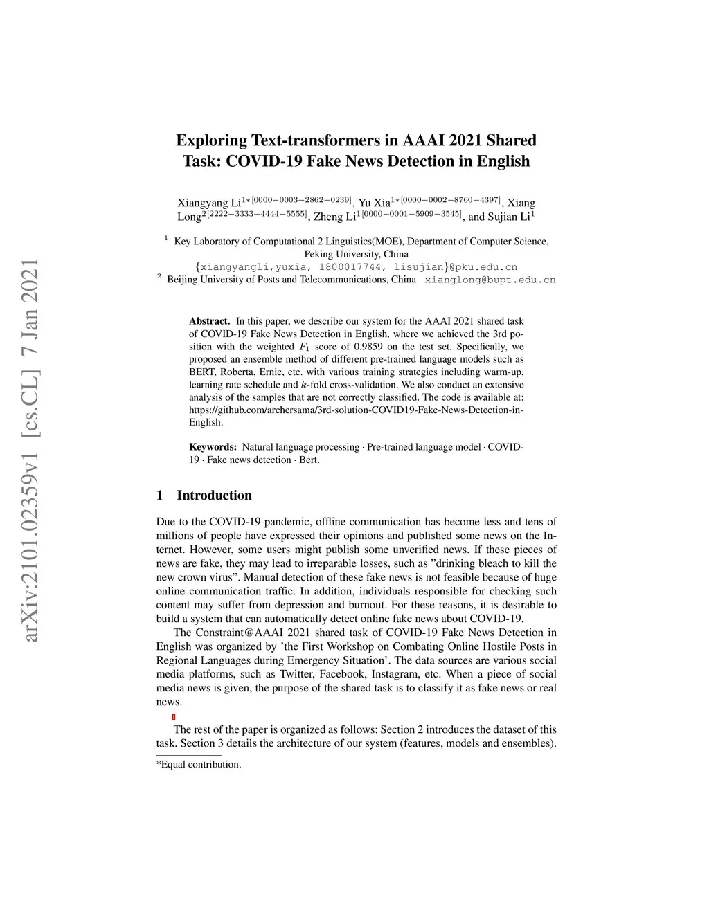 In this paper, we describe our system for the AAAI 2021 shared task of COVID-19 Fake News Detection in English, where we achieved the 3rd position with the weighted F1 score of 0.9859 on the test set. Specifically, we proposed an ensemble method of different pre-trained language models such as BERT, Roberta, Ernie, etc. with various training strategies including warm-up,learning rate schedule and k-fold cross-validation. We also conduct an extensive analysis of the samples that are not correctly classified. The code is available at:https://github.com/archersama/3rd-solution-COVID19-Fake-News-Detection-in-English.