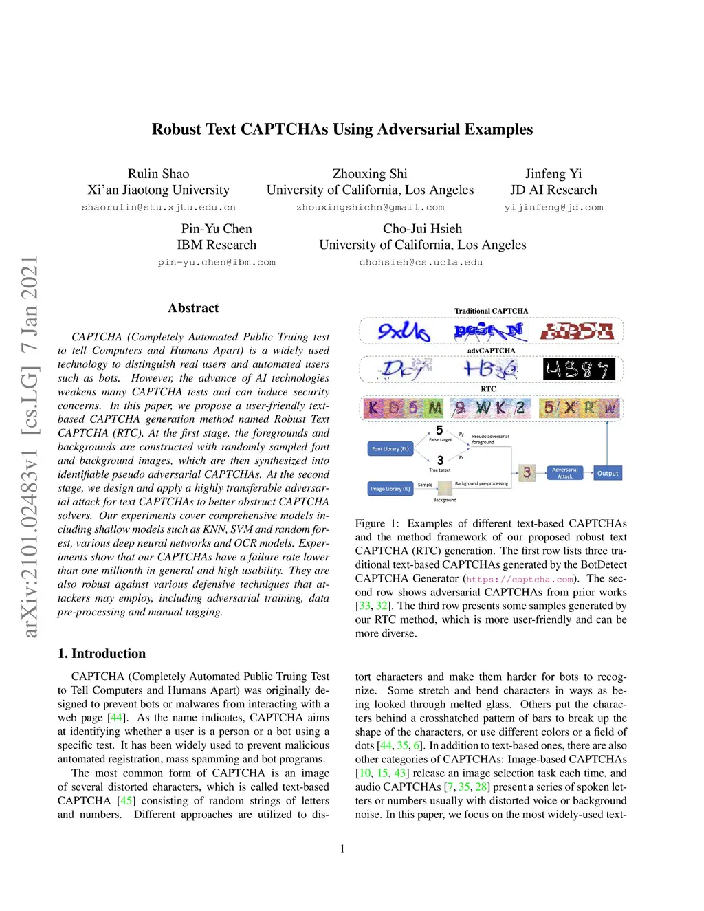 CAPTCHA (Completely Automated Public Truing test to tell Computers and Humans Apart) is a widely used technology to distinguish real users and automated users such as bots. However, the advance of AI technologies weakens many CAPTCHA tests and can induce security concerns. In this paper, we propose a user-friendly text-based CAPTCHA generation method named Robust Text CAPTCHA (RTC). At the first stage, the foregrounds and backgrounds are constructed with randomly sampled font and background images, which are then synthesized into identifiable pseudo adversarial CAPTCHAs. At the second stage, we design and apply a highly transferable adversarial attack for text CAPTCHAs to better obstruct CAPTCHA solvers. Our experiments cover comprehensive models including shallow models such as KNN, SVM and random forest, various deep neural networks and OCR models. Experiments show that our CAPTCHAs have a failure rate lower than one millionth in general and high usability. They are also robust against various defensive techniques that attackers may employ, including adversarial training, data pre-processing and manual tagging.