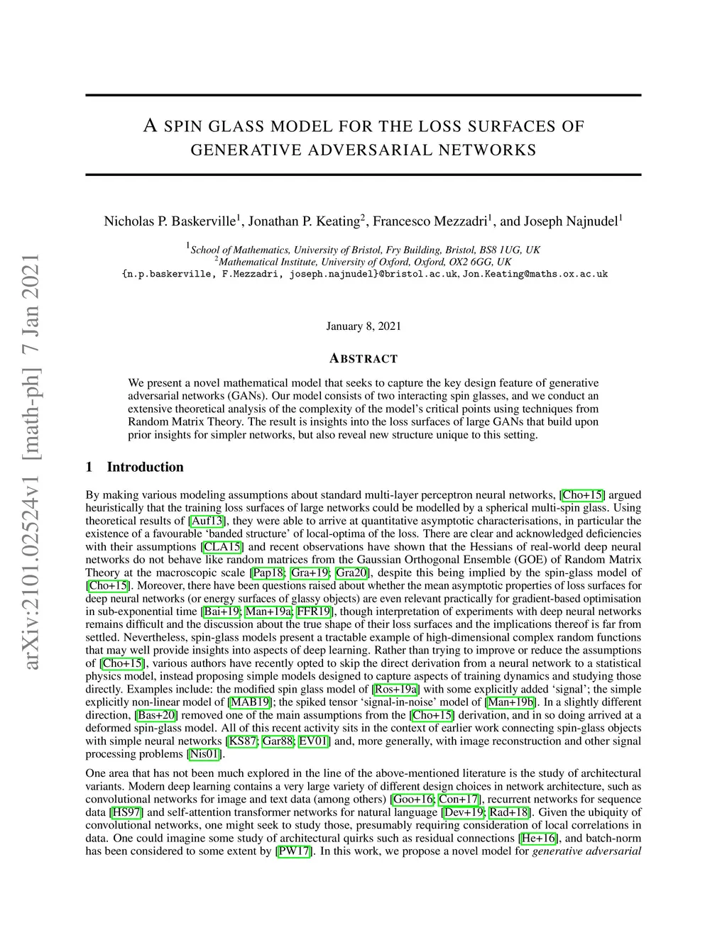 We present a novel mathematical model that seeks to capture the key design feature of generative adversarial networks (GANs). Our model consists of two interacting spin glasses, and we conduct an extensive theoretical analysis of the complexity of the model's critical points using techniques from Random Matrix Theory. The result is insights into the loss surfaces of large GANs that build upon prior insights for simpler networks, but also reveal new structure unique to this setting.